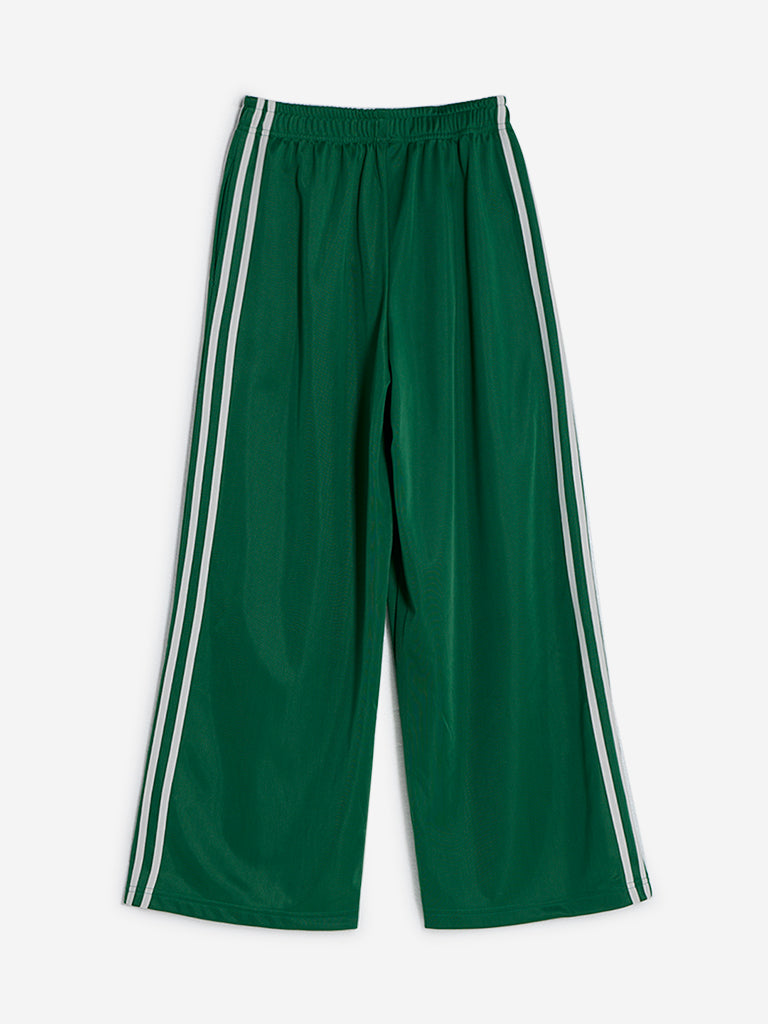 These green track pants from Y&F Kids are adorned with stripes. Fashioned from a moisture-wicking fabric. the mid-rise pair comes with an elasticated waistband and two side pockets.