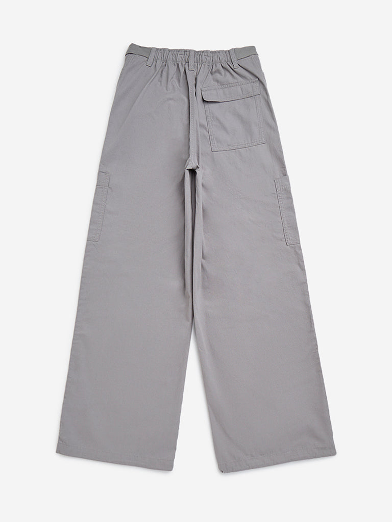These grey trousers from Y&F Kids are tailored from a cotton-rich fabric for lasting comfort. Designed with a mid-rise fit. they feature an elasticated waistband with a buckle. belt loops. a zipper fly. and multiple pockets for added functionality.
