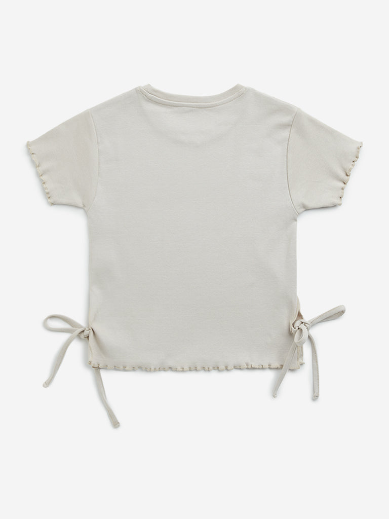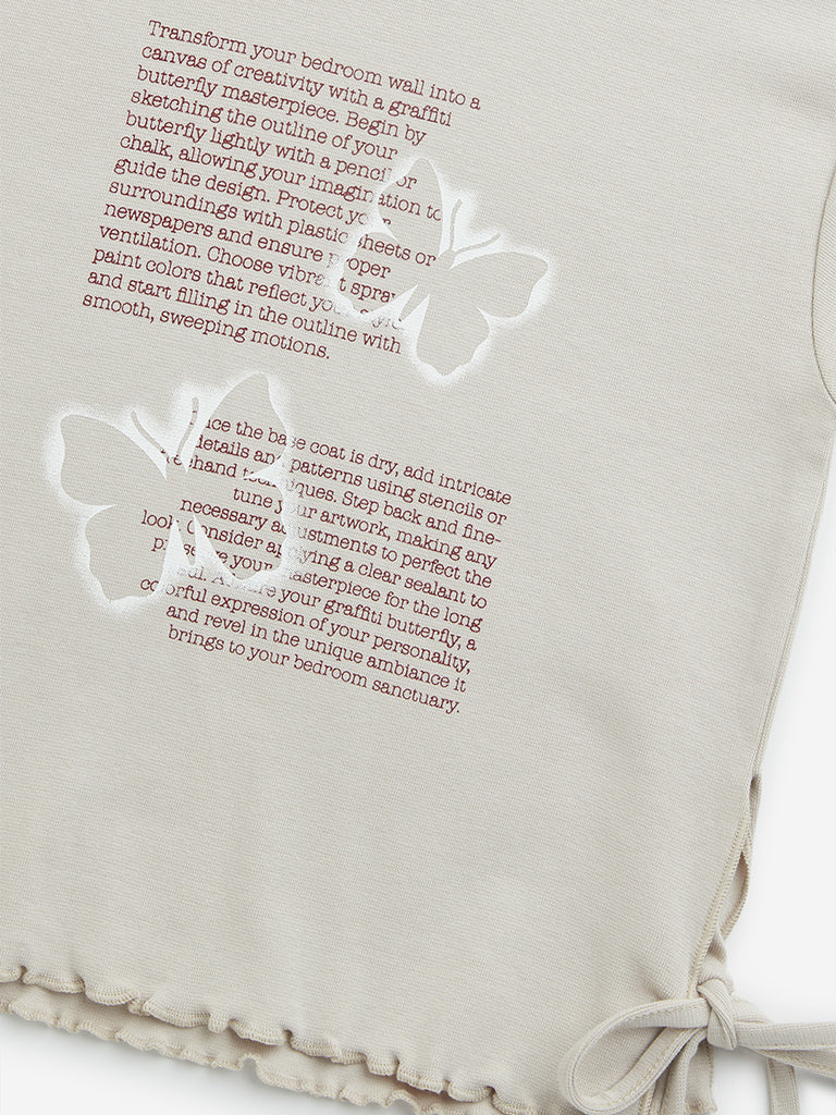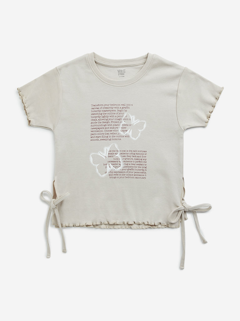 This light beige t-shirt by Y&F kids showcases a blend of typographic prints and butterfly patterns. Crafted from a breathable fabric. it features a crewneck and short sleeves. The tie-up detailing at the hem adds a stylish touch.