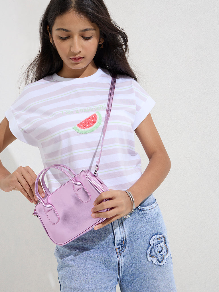 Y&F Kids introduces this white t-shirt with soft lilac stripes. crafted from breathable pure cotton. Accented with playful watermelon-hued embroidery on the front. it features a round neck and relaxed dolman sleeves—ideal for everyday comfort with a fun twist.