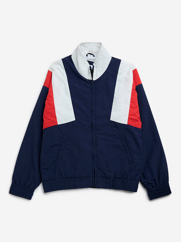 This navy jacket from Y&F Kids is designed in a colour-blocked profile. Made from a moisture-wicking fabric. it includes a high-neck collar that extends to a zipper placket and full sleeves.