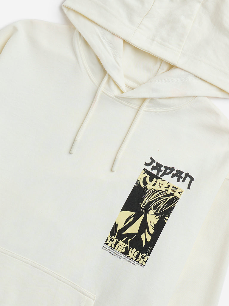 Y&F Kids introduces this off-white sweatshirt boasting anime-inspired designs. Crafted from a cotton-rich fabric. it includes a hood and full sleeves. The kangaroo pockets render practicality.
