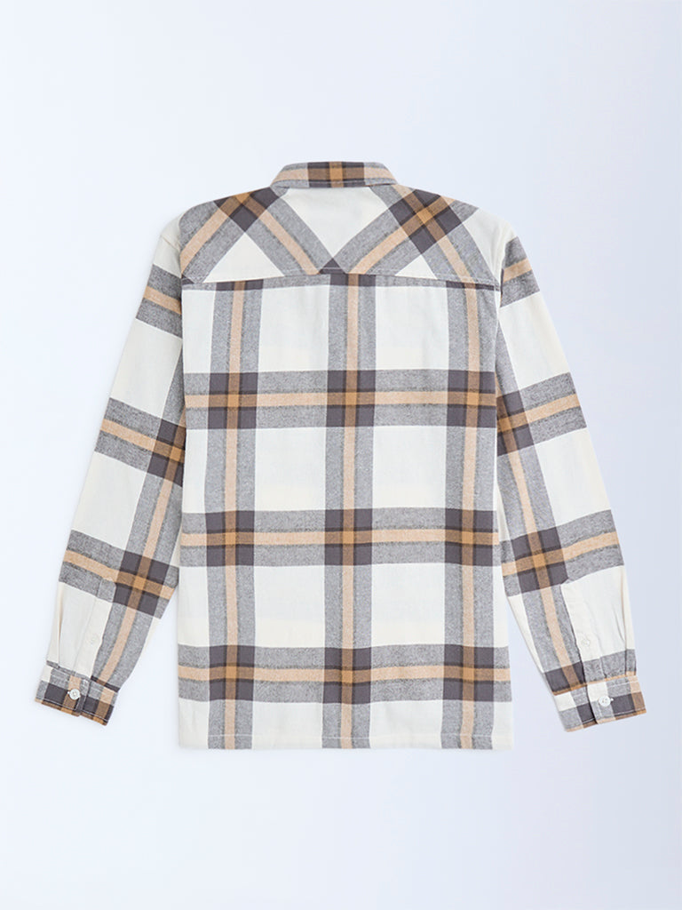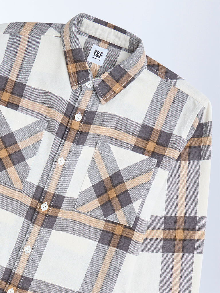 Y&F Kids brings this off-white checkered shirt. framed with a straight-point collar. a button-up front and full sleeves. Milled from pure cotton fabric for uncompromised comfort. it is finished with two chest pockets that adds structure to the design. A refined choice for casual dressing.