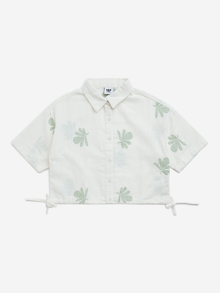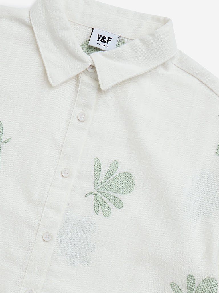 Y&F Kids presents this off-white shirt. adorned with delicate floral embroidery for a touch of feminine charm. Crafted from a soft cotton-rich fabric for all-day comfort. it features a classic collar. a button-down front. and short sleeves. offering a polished and structured look.