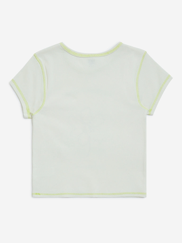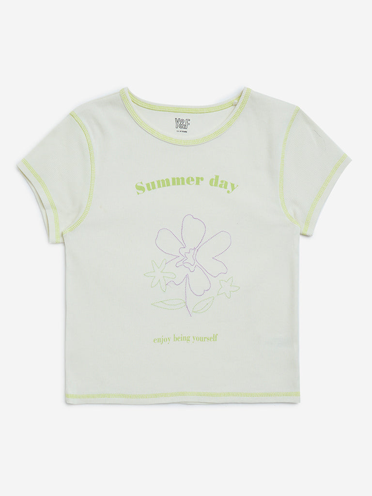 This off-white t-shirt from Y&F Kids spotlights delicate floral motifs paired with playful text prints for a fun look. Styled with a round neck and short sleeves. it’s crafted from a soft cotton-blend fabric. ensuring all-day comfort for her playtime adventures.