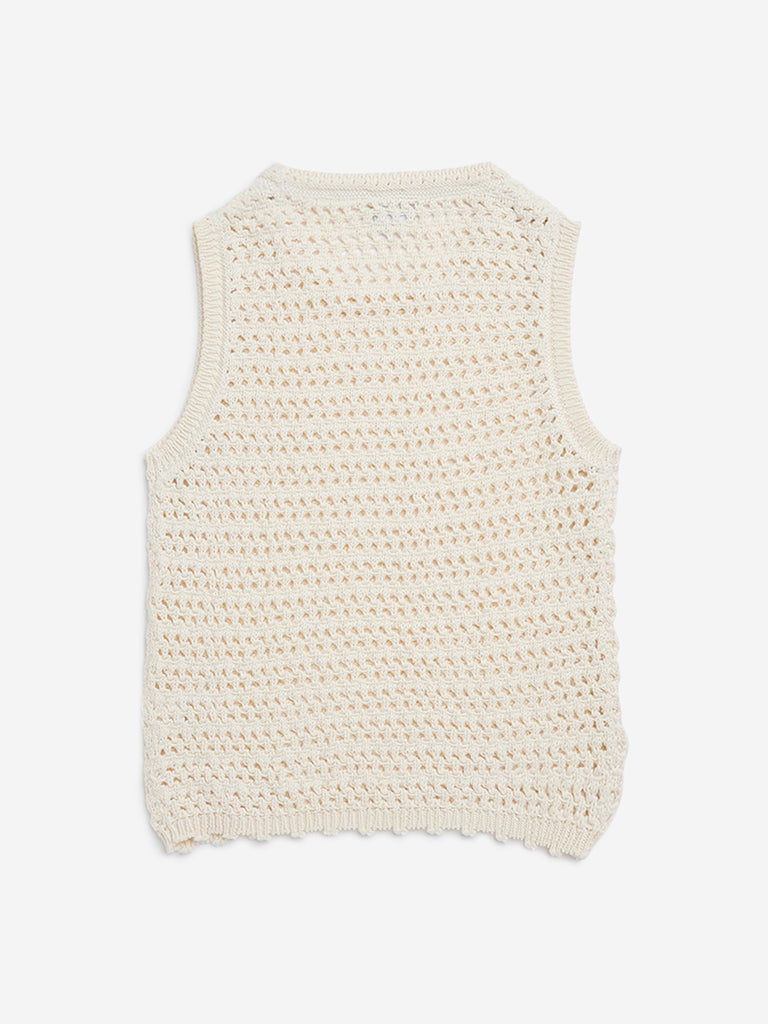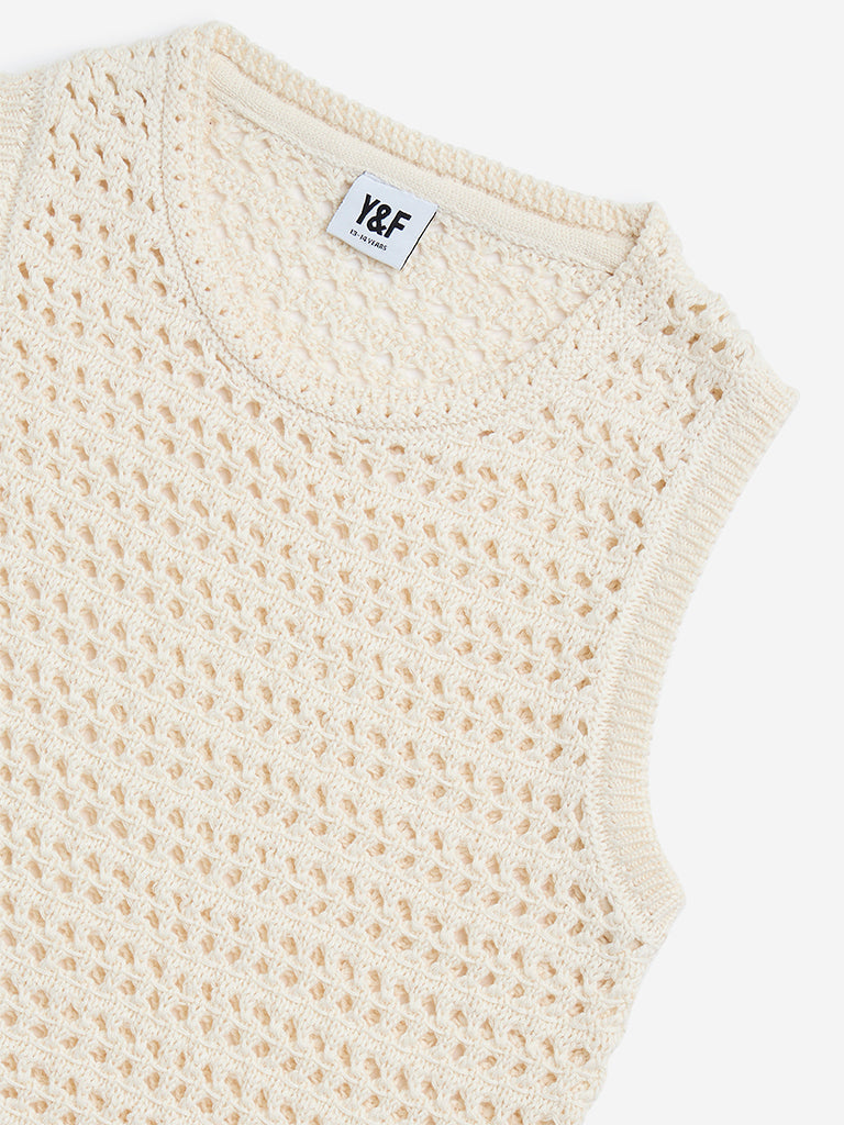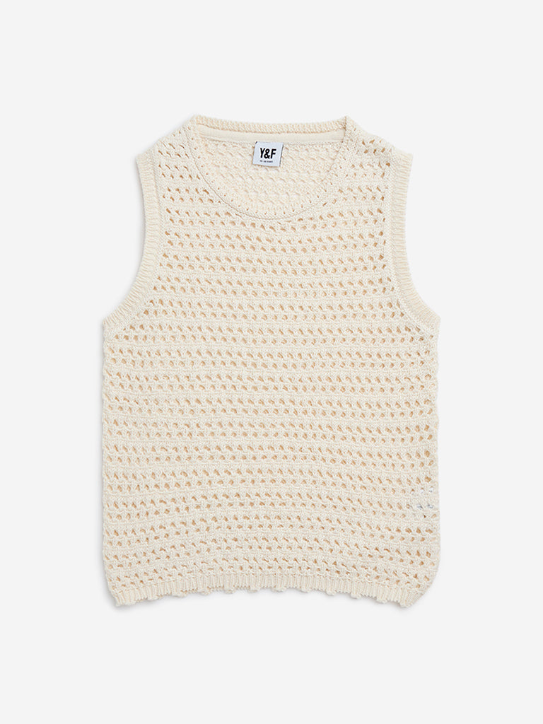 This off-white knitted top from Y&F Kids is crafted from a soft cotton blend for a cozy feel. Designed with a classic round neckline and a sleeveless cut. it’s a versatile pick for layering or wearing solo on warm days.