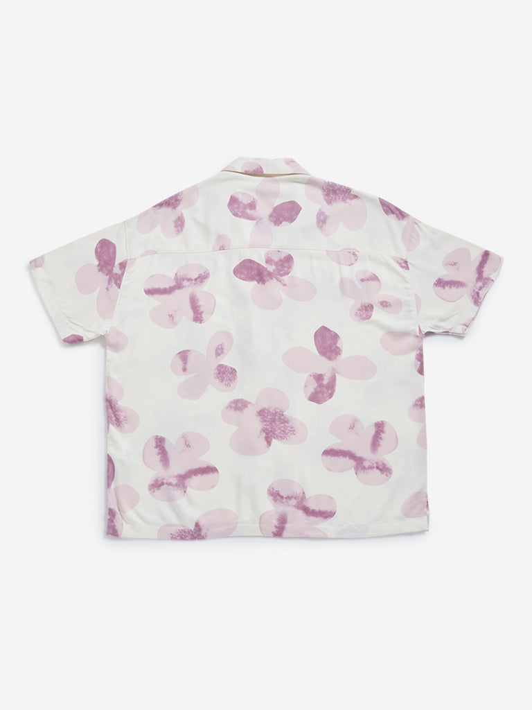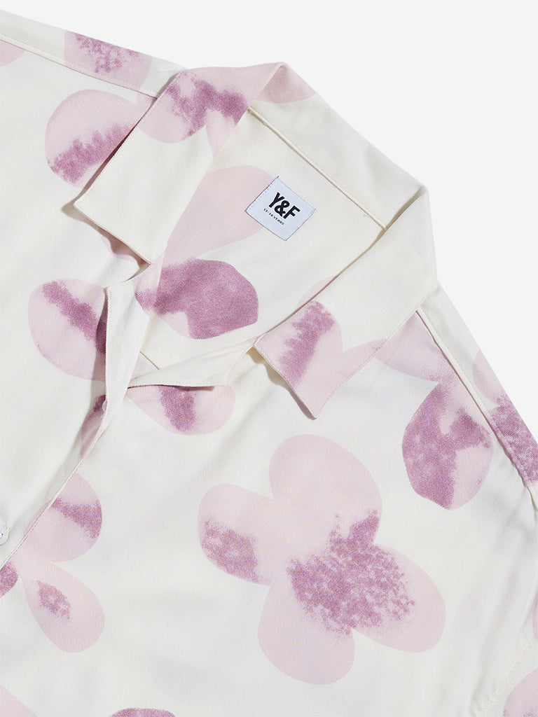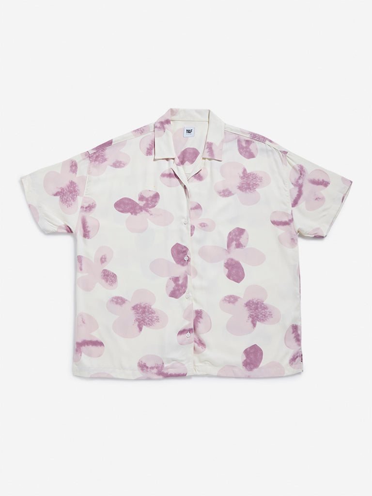 This off-white pure cotton shirt by Y&F Kids features short sleeves and a notched-collar. It is adorned with pink prints all over for an adorable look.