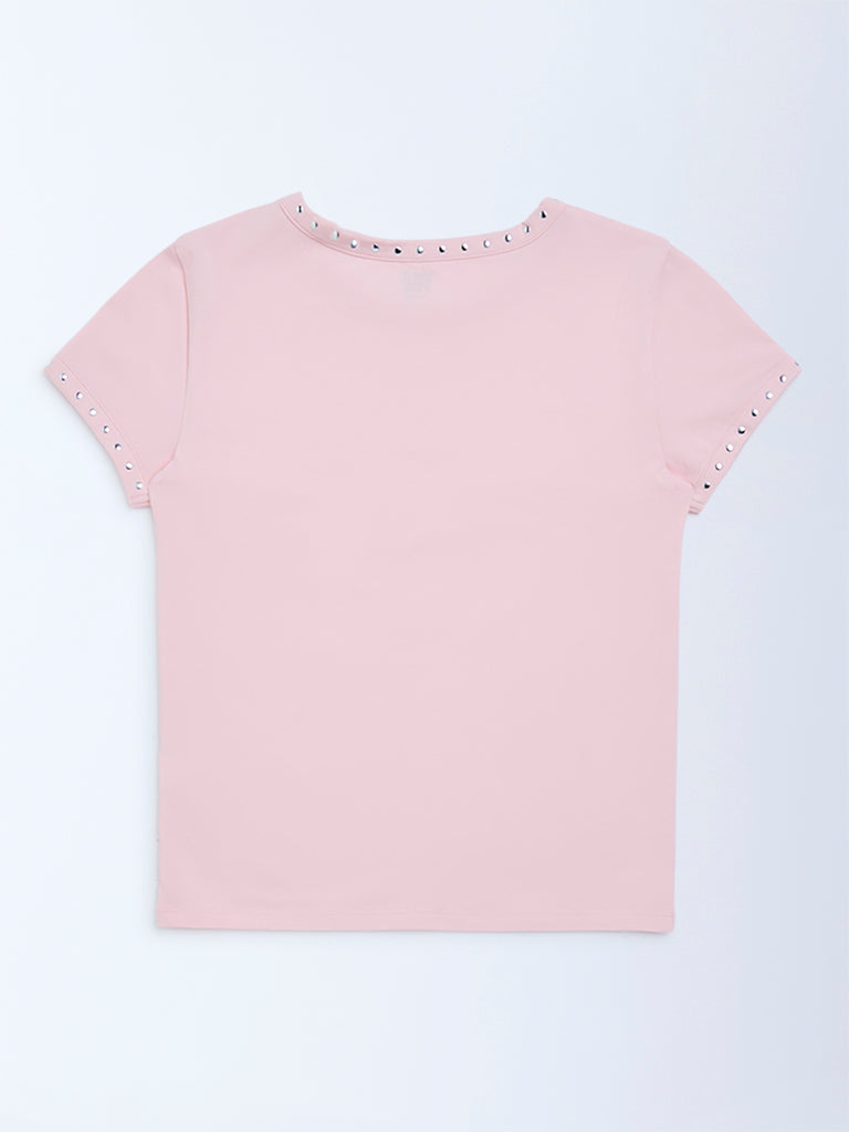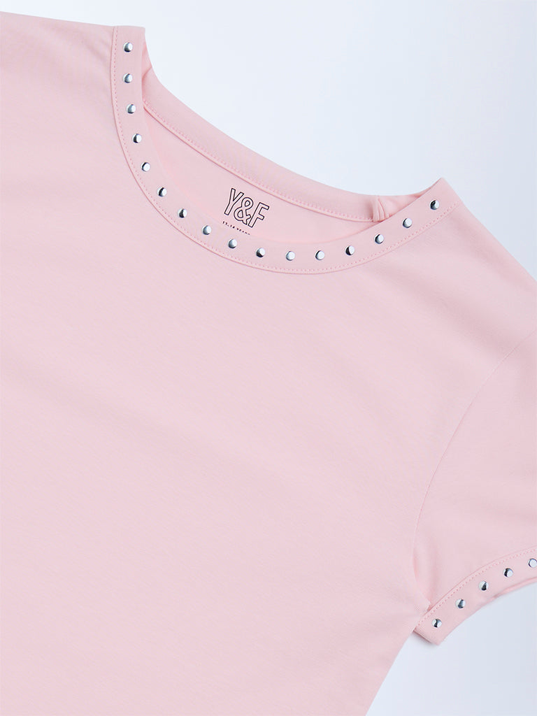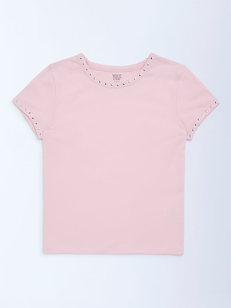 Y&F Kids Pink Stud-Detailed Cotton-Blend T-Shirt