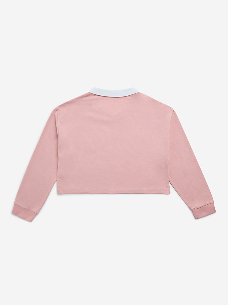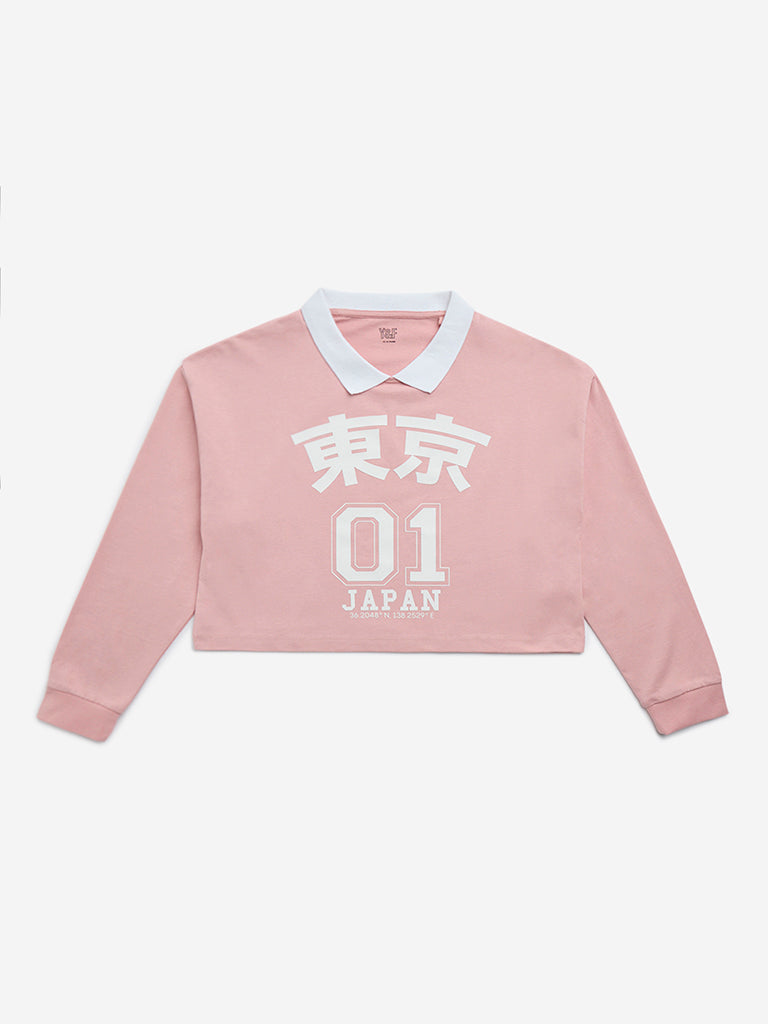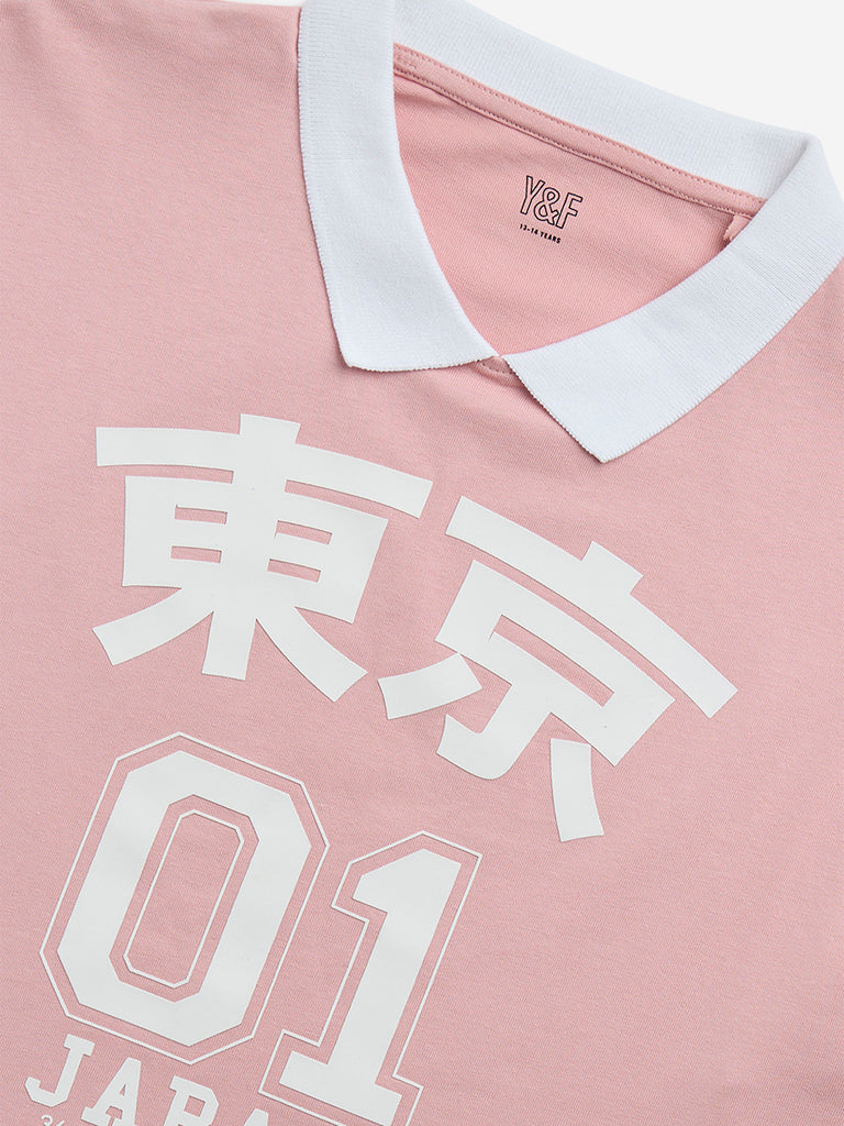 Fashioned in a cropped frame. this pink t-shirt from Y&F Kids showcases Japanese text designs at the front. It is crafted from a pure-cotton with a collar and full sleeves.