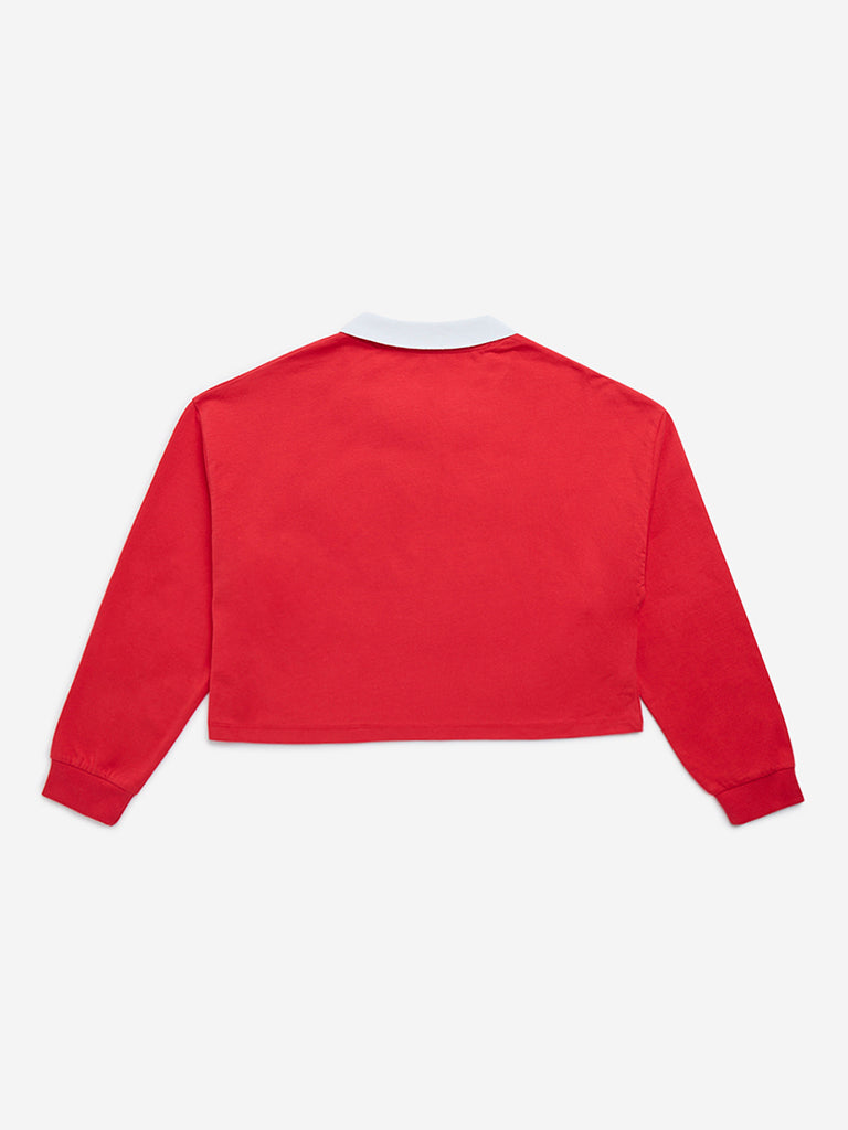 This vibrant red t-shirt from Y&F Kids is made from a cotton-rich fabric with a collar and full sleeves. It sports text designs at the front for added style.