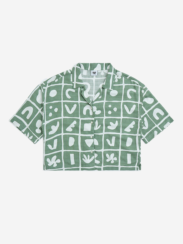 This sage shirt by Y&F Kids is defined by abstract motifs. Woven from a luxurious cotton-linen blend for easy comfort. it is designed with a camp collar. a button placket. and short sleeves.