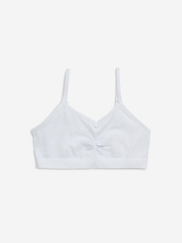 Y&F Kids launches this white crop top featuring ribbed texture. Made with soft and stretchable fabric. it features slight ruched detailing. a V-neck. and a sleeveless cut. The elastic waistband ensures a secured fit.