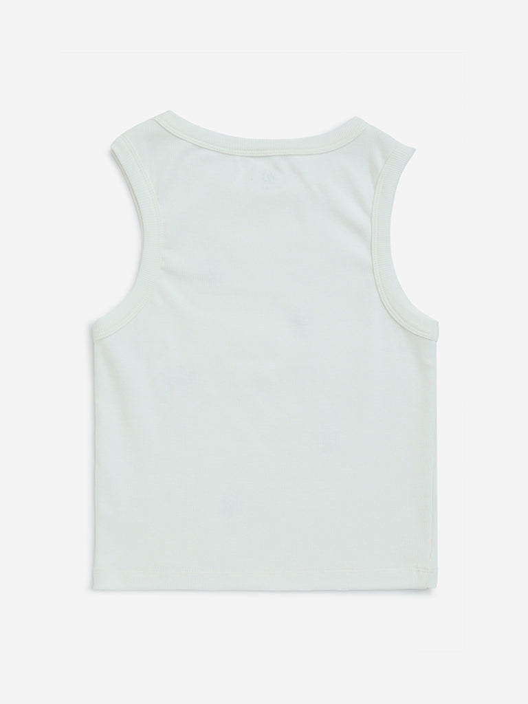This white top from Y&F Kids showcases beautiful floral motifs for a charming touch. Woven from a cosy cotton-blend fabric. it features a round neck and a sleeveless cut. making it a comfortable choice for warm-weather wear.