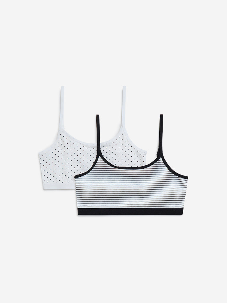 This set of two white crop tops from Y&F Kids is crafted from pure cotton for a breathable feel. Featuring stylish striped and polka dot variants. each piece is designed with a classic scoop neck and adjustable straps for a comfortable. customizable fit.