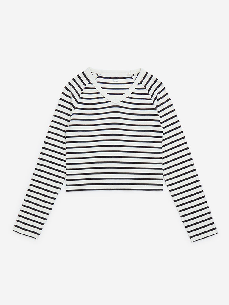 This white t-shirt from Y&F Kids showcases striped prints. Crafted from a blended-cotton fabric. it comes finished with a V-neck and raglan sleeves.