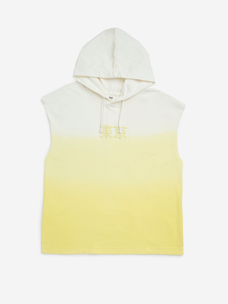 This yellow hoodie by Y&F Kids showcases a stunning ombre finish accented with Japanese text embroidery. Crafted from pure cotton. it is styled with an attached hood. adjustable drawstrings. and a sleeveless silhouette for a trendy appeal.