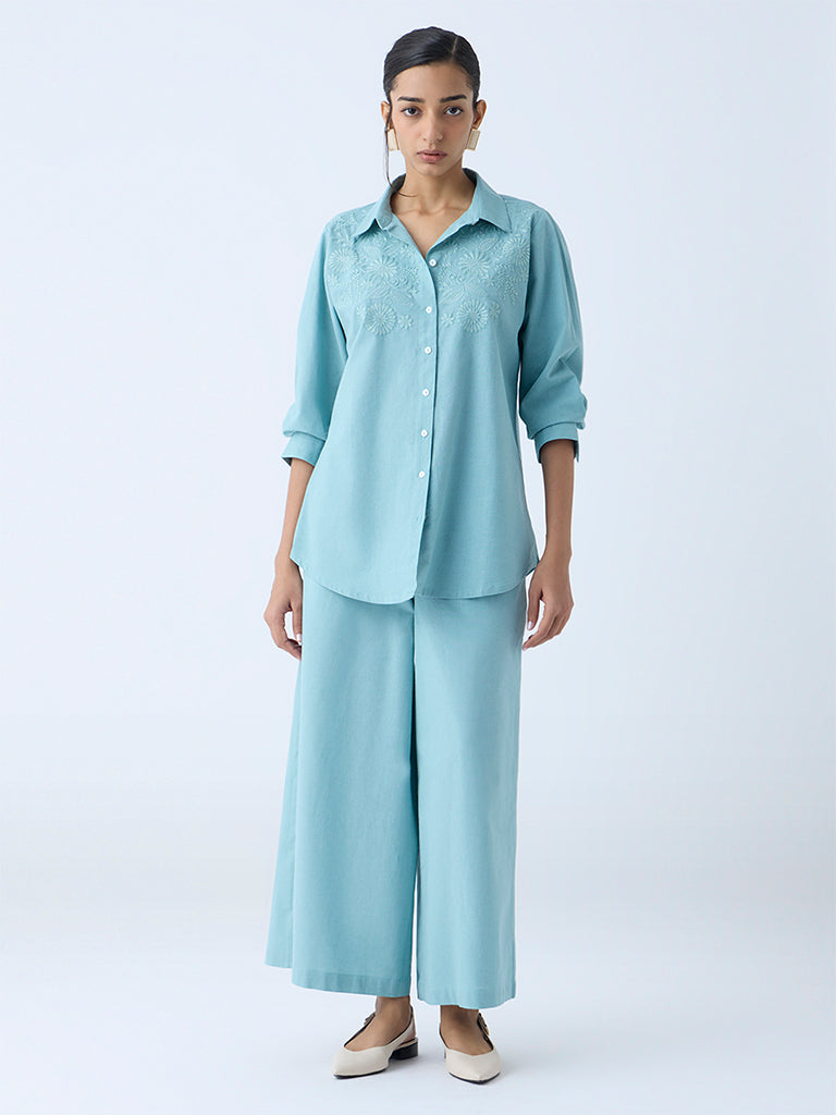 Tailored for quiet sophistication. this aqua palazzos from Zuba is crafted from a breathable cotton-blend fabric that drapes with graceful fluidity. The smooth elastic waistband ensures all-day comfort. while discreet side pockets lend everyday practicality. With its wide-leg silhouette and easy movement. it pairs beautifully with embroidered kurtas or contemporary tops for a refined. relaxed look.