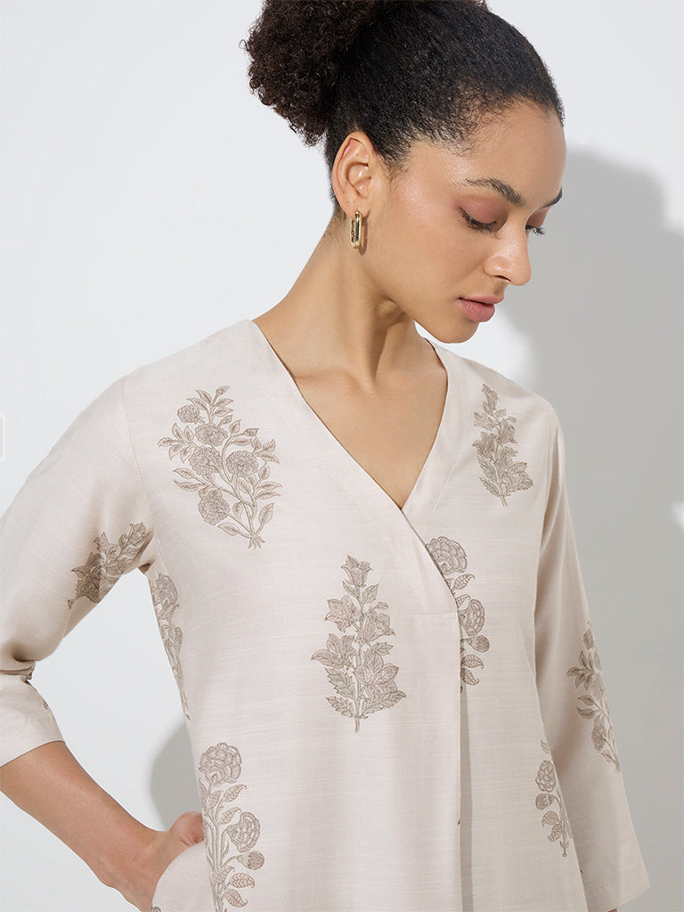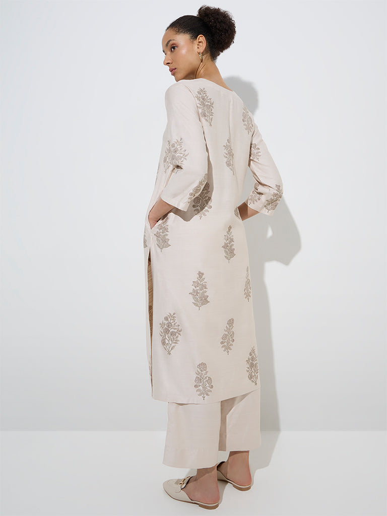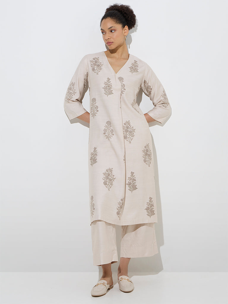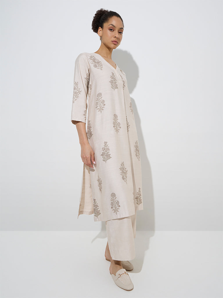 Zuba Beige Botanical Print Silk A-Line Kurta