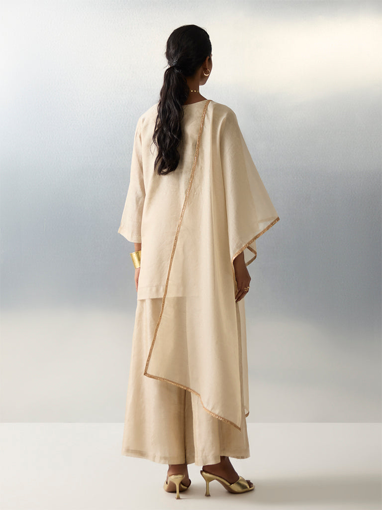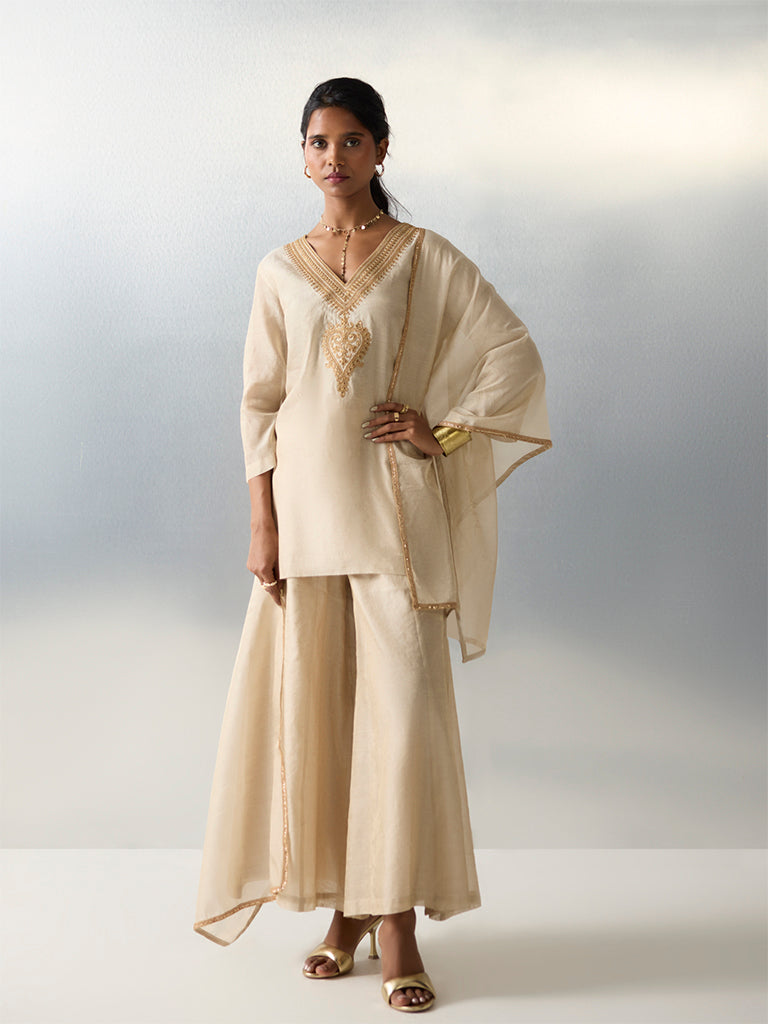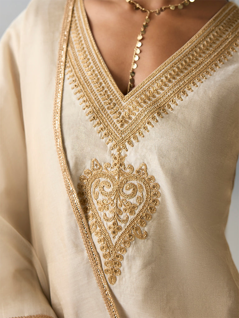 This beige kurti from Zuba is cut from a premium-blend fabric that combines a gentle shimmer with a smooth. soft touch. Highlighting with intricate embellished embroidery. it is styled with a V-neck and three-quarter sleeves. A statement tunic for both daily wear and festive gatherings.