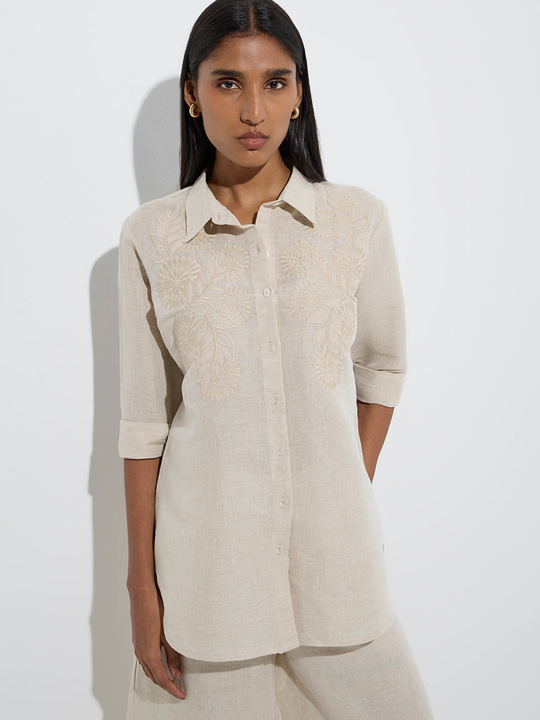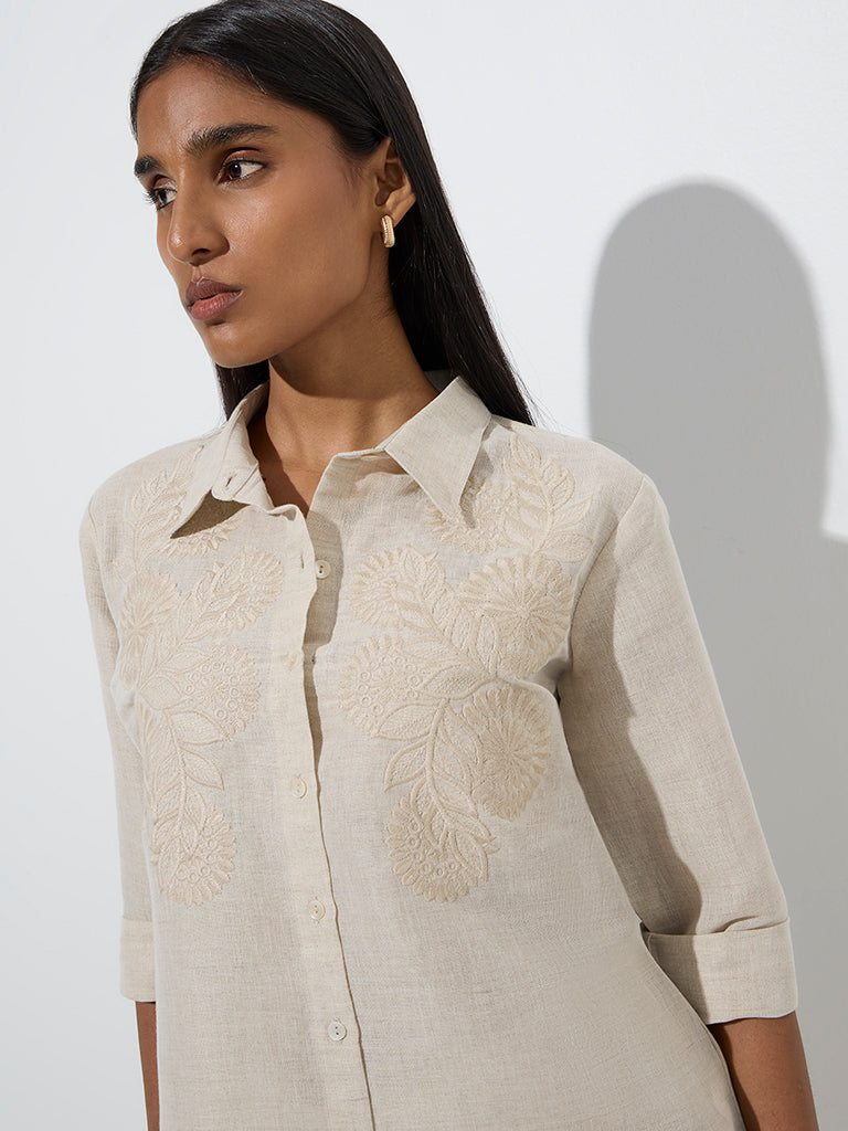 Zuba Beige Floral Embroidered Linen-Blend Tunic