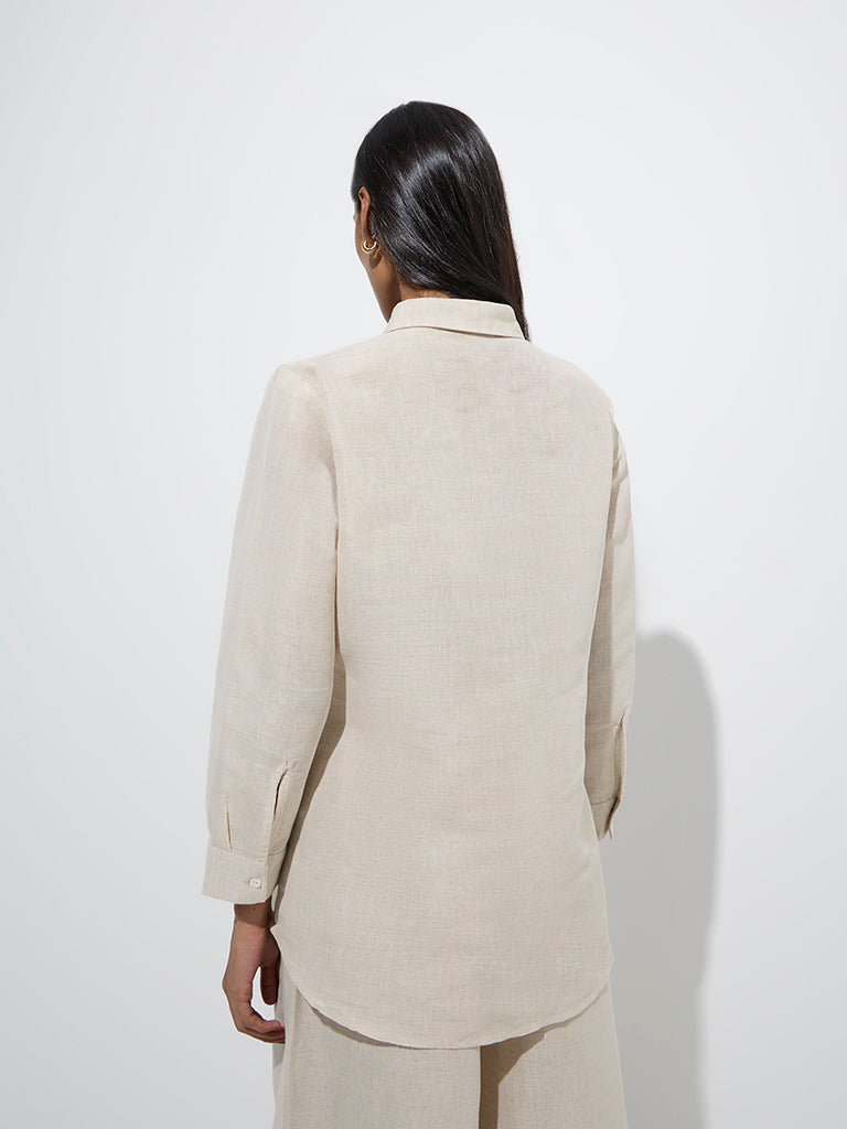 Woven from a sumptuous cotton-linen blend. this beige tunic from Zuba showcases tonal floral embroidery. It features a semi-spread collar. full sleeves. and a button placket—combining refined details with breathable comfort.