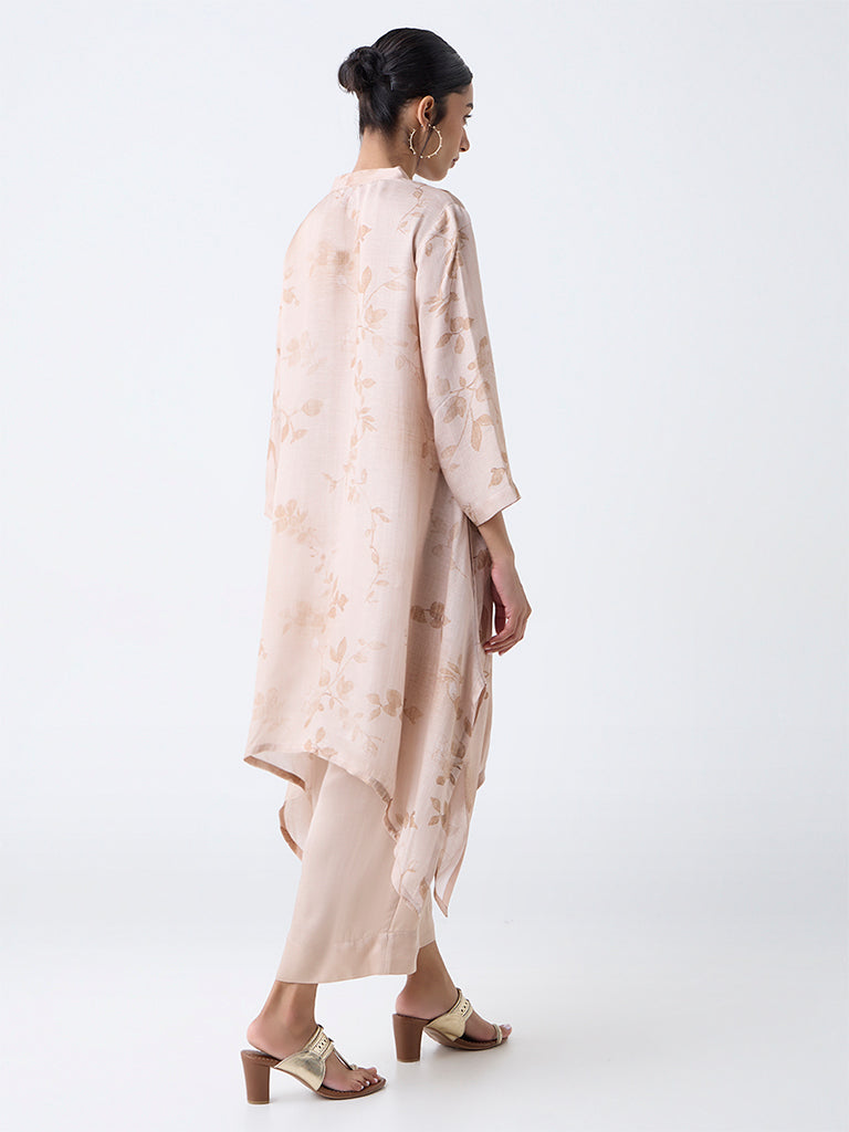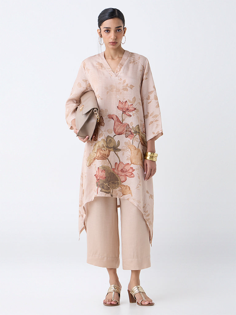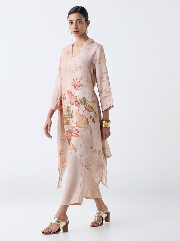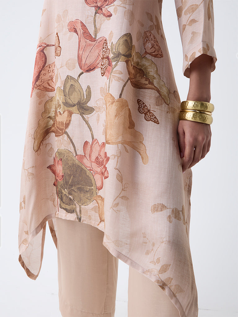 Elevate everyday moments with this beige kurta from Zuba. Decorated with exquisite floral motifs and crafted from luxurious linen. it features a V-neck and three-quarter sleeves for effortless comfort. The asymmetrical hemline adds a contemporary twist. making it a versatile piece that seamlessly transitions from casual outings to festive gatherings.