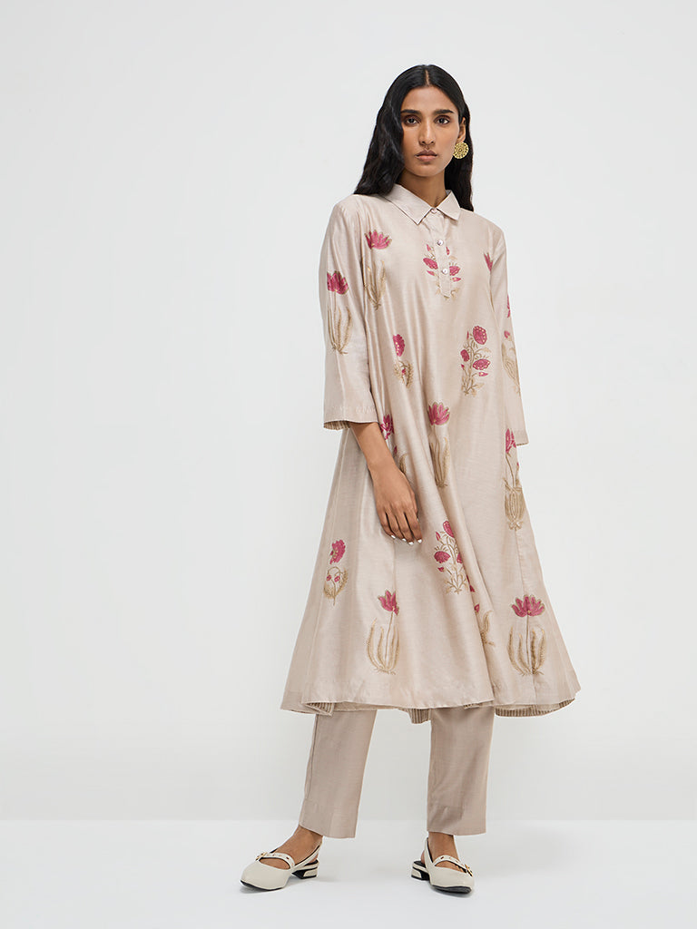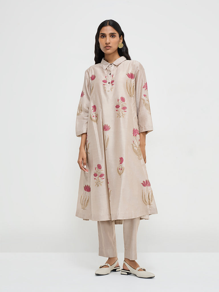 Zuba Beige Floral Printed Cotton-Blend A-Line Kurta with Inner