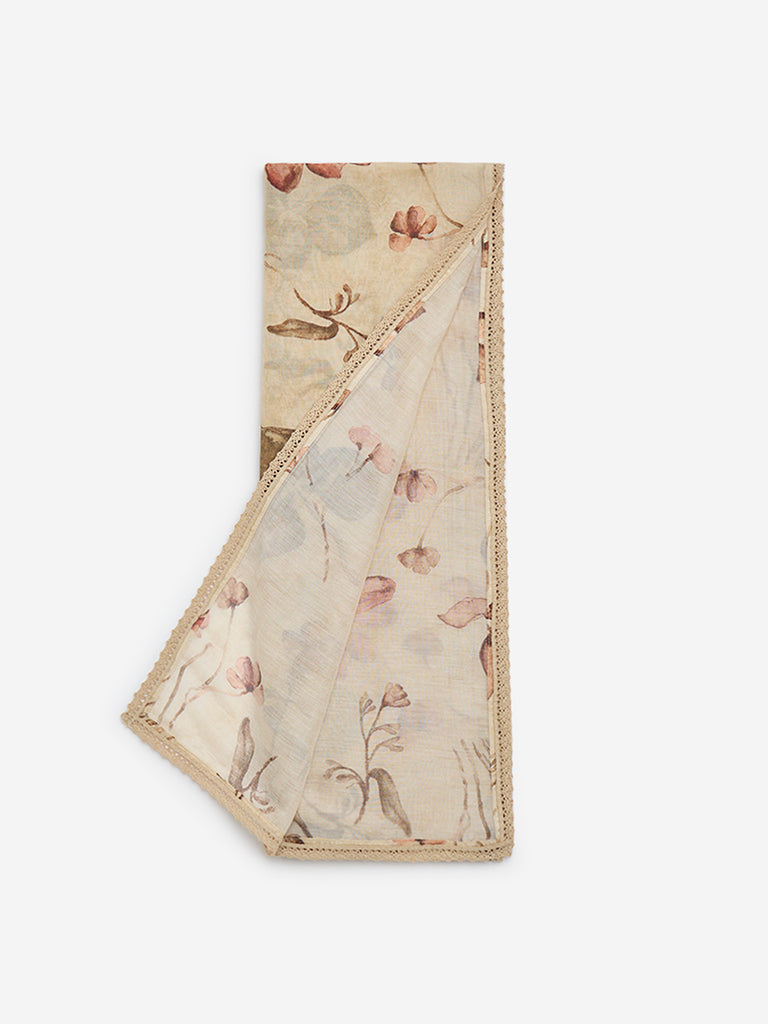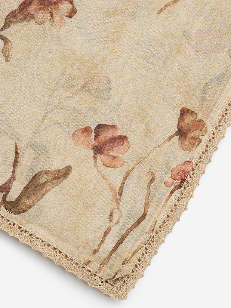 This beige stole from Zuba showcases elegant foliage prints. accented with a delicate crochet trim for a refined touch. Spun from a lightweight fabric. it drapes effortlessly and pairs beautifully with the matching kurta and palazzos for a coordinated look.