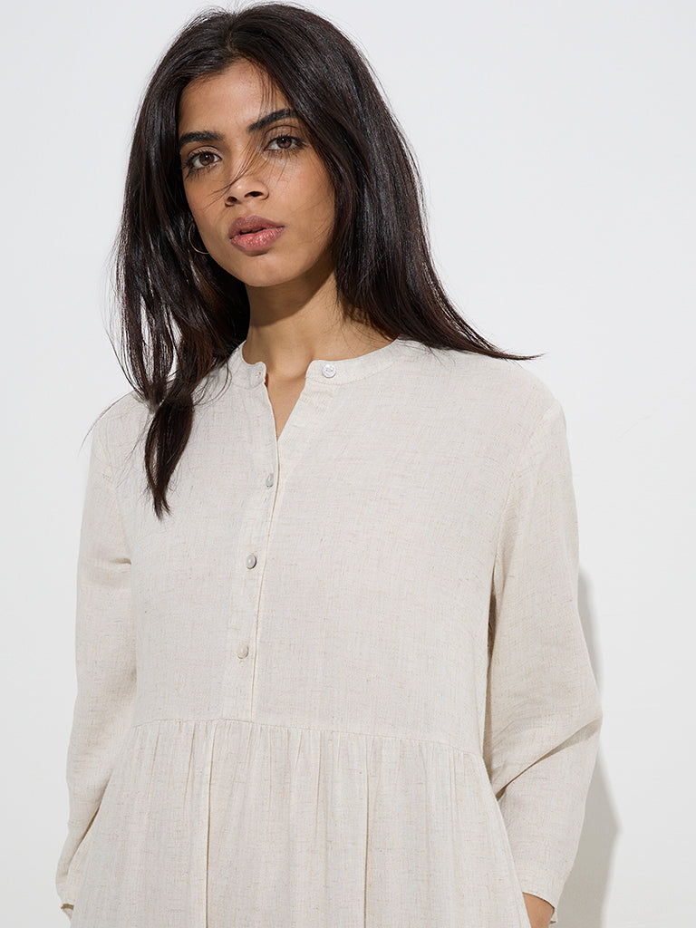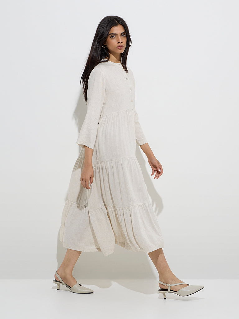 Zuba Beige Solid Linen-Blend Tiered Dress