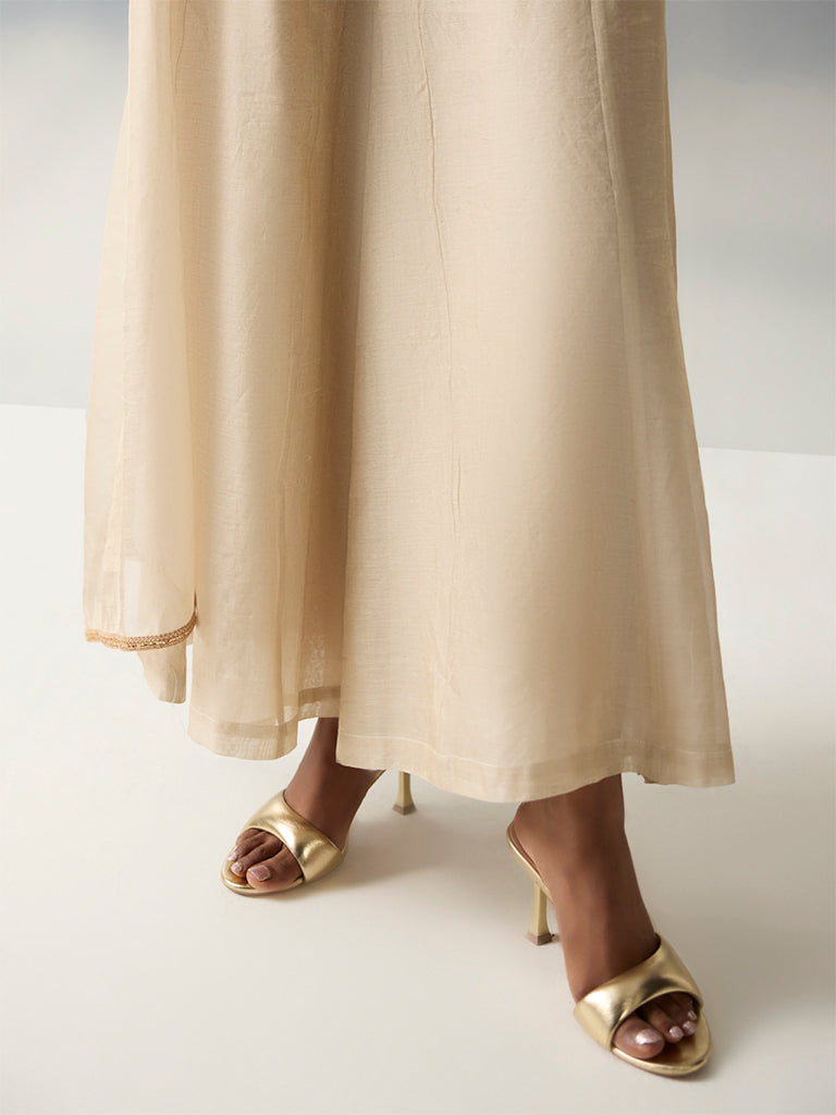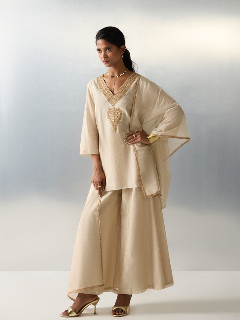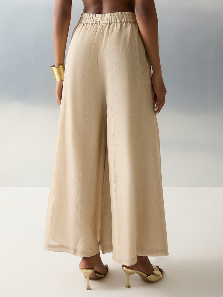 Assemble your ethnic outfits with this beige palazzos from Zuba. crafted from a breathable fabric with a subtle metallic exterior. Fitted with an elasticated waist and adjustable drawstrings. it is a stylish base that pairs effortlessly with kurtas for festive and everyday occasions.