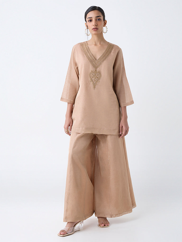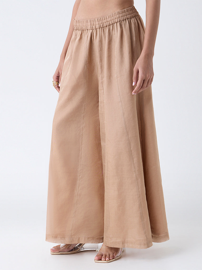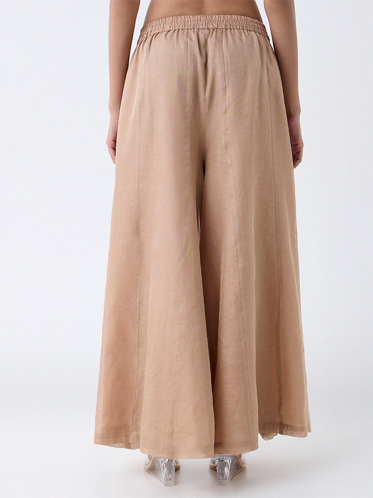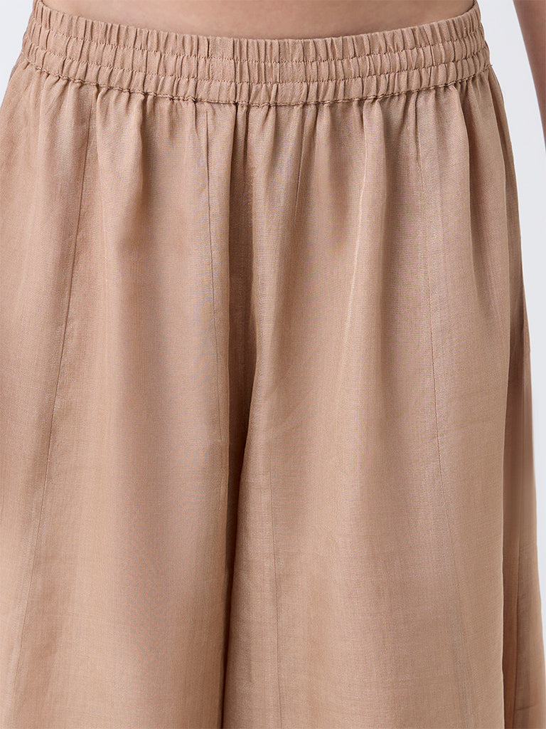These beige palazzos from Zuba showcase a wide-leg silhouette that moves gracefully with every step. A smooth elastic waistband with adjustable drawstrings ensures a personalized fit. while the breathable fabric flows freely. making them perfect for relaxed days or festive occasions.