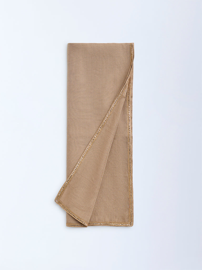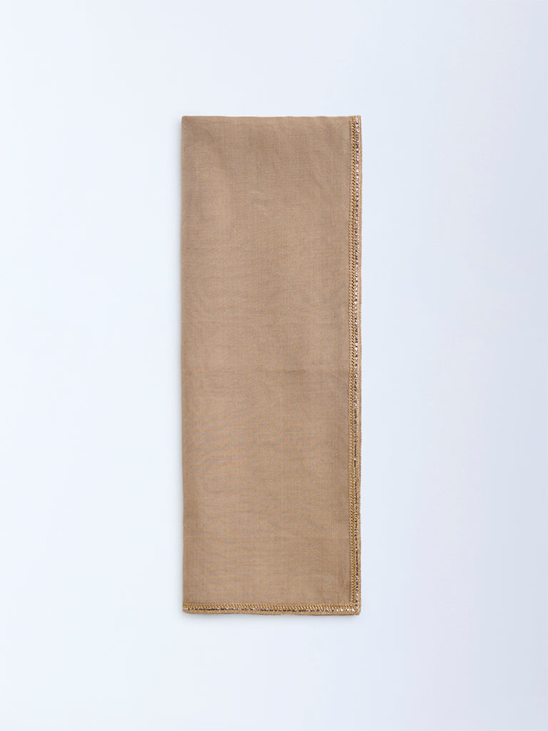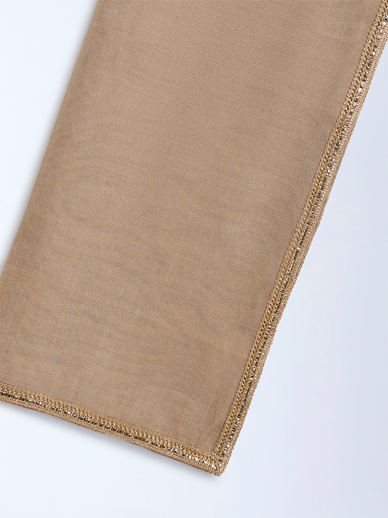 Complete your look in refined luxury with this beige dupatta from Zuba. Detailed with shimmering zari work at the borders. it adds a polished touch to your festive ensembles.
