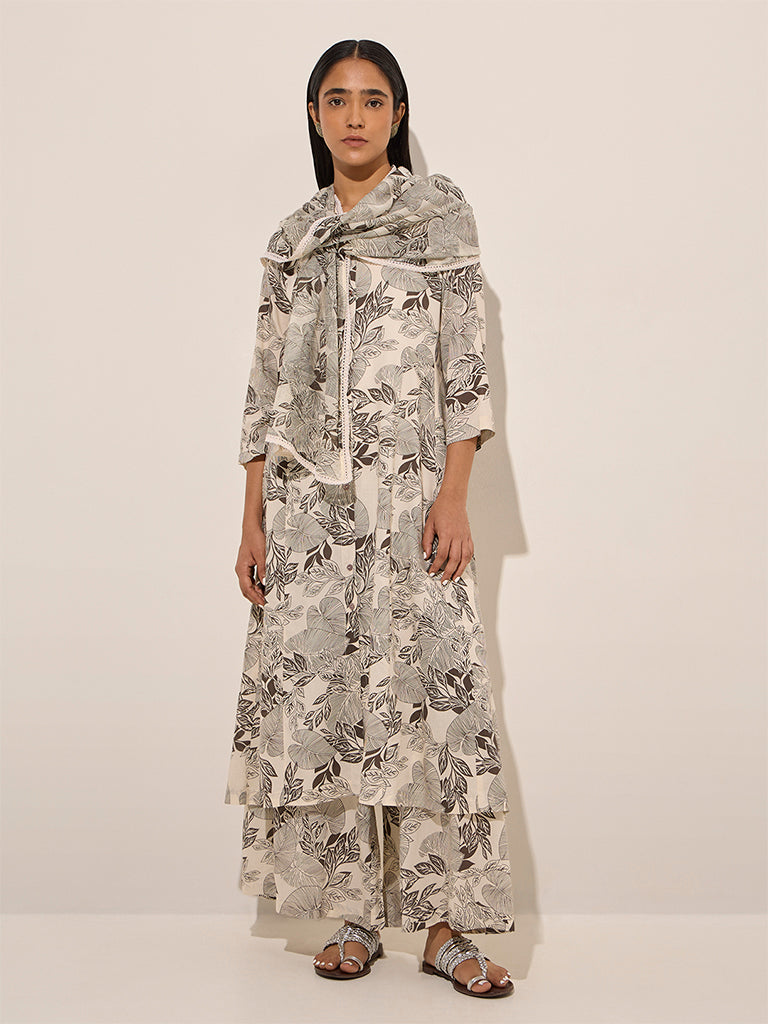 This black stole from Zuba showcases delicate floral prints. adding a touch of elegance to your outfit. Crafted from lightweight fabric. it pairs beautifully with the matching kurta and palazzos for a coordinated look. (Sold separately)