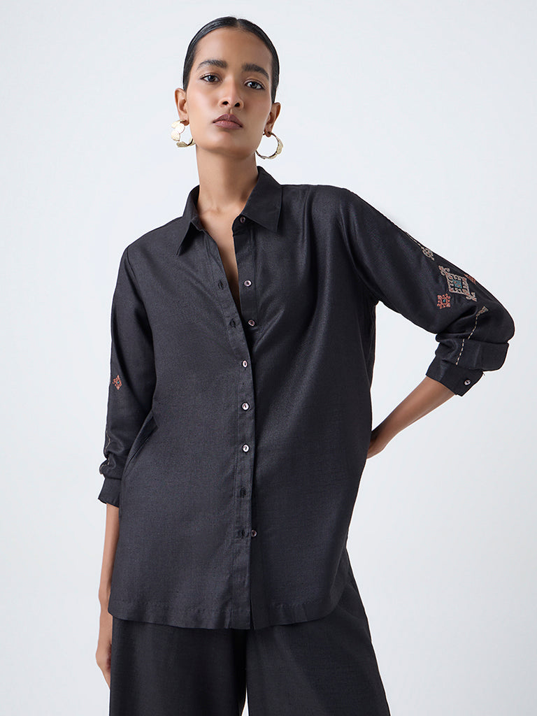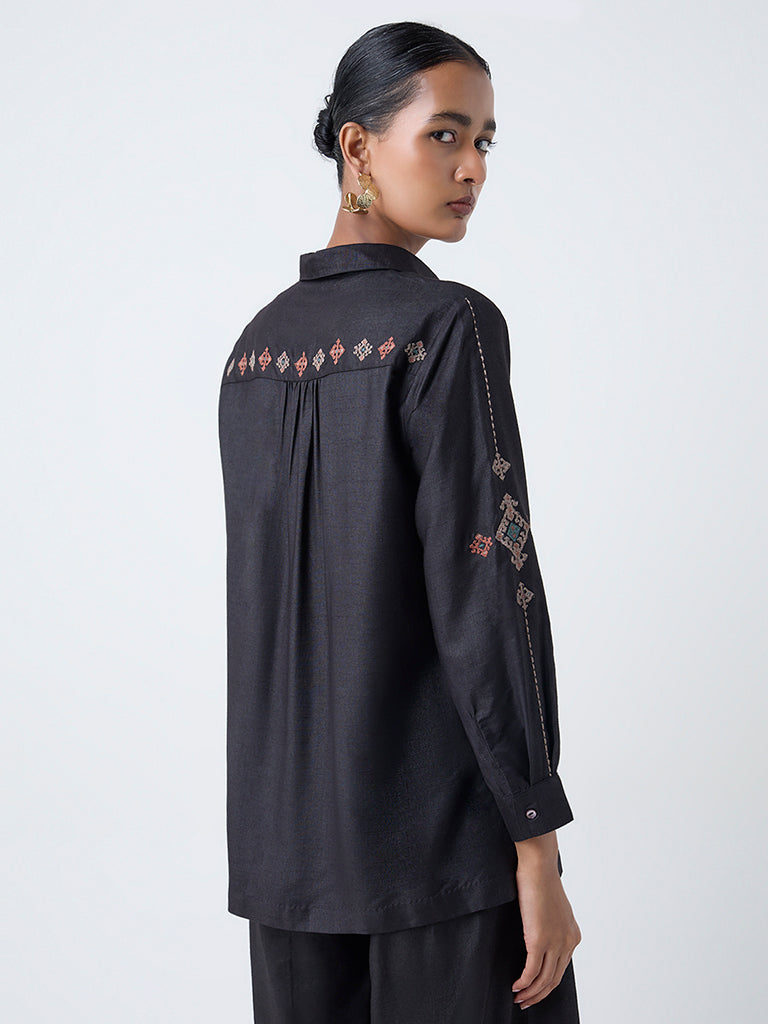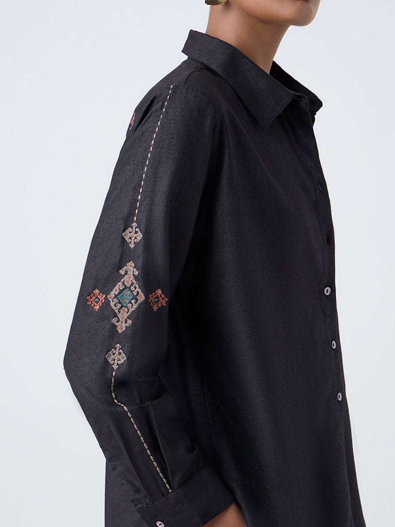 A timeless classic with a festive touch. this black tunic from Zuba is adorned with intricate embroidery and fine detailing that elevate its minimal silhouette. Designed with a classic collar and full sleeves. it is crafted from a luxurious fabric that feels soft against the skin.