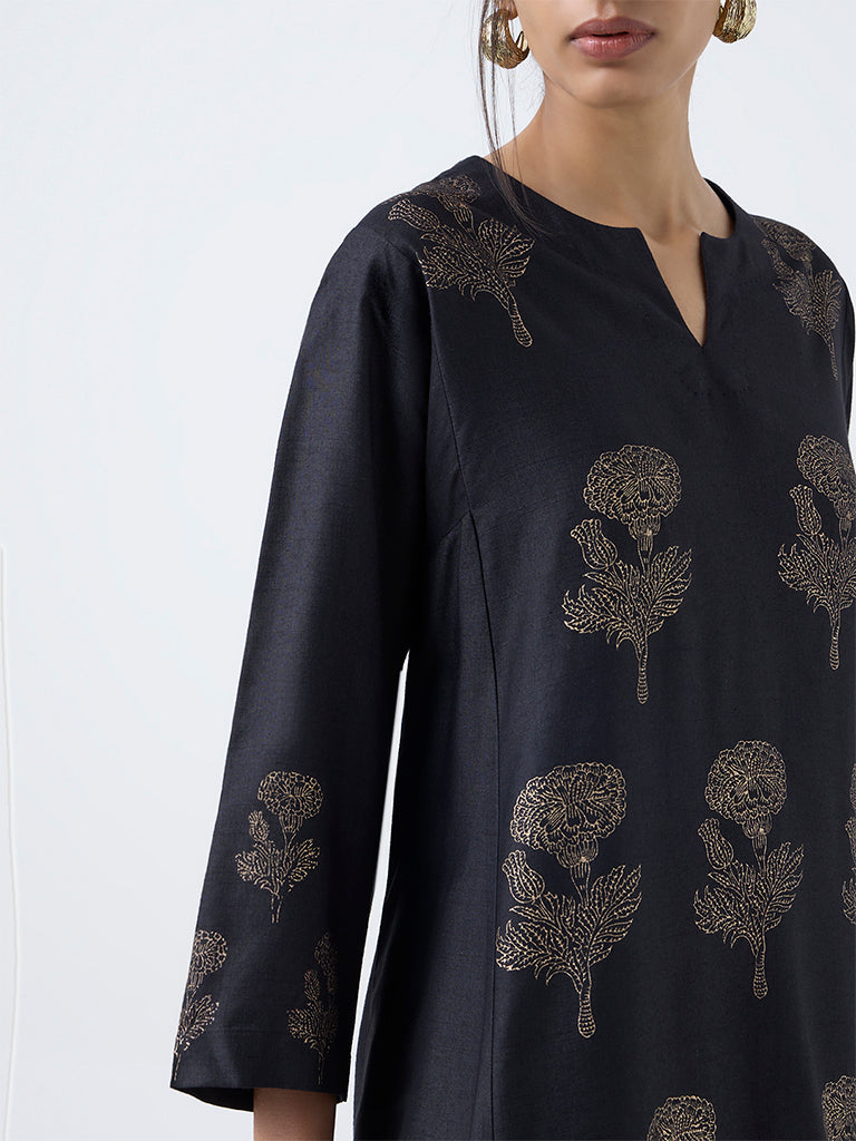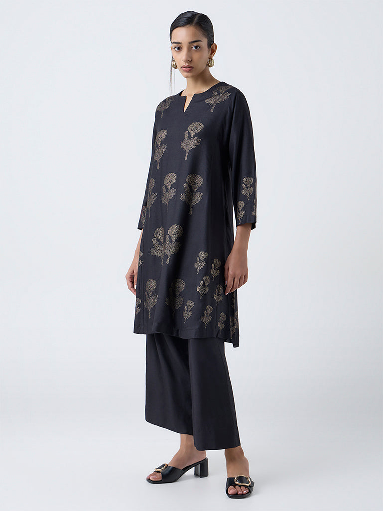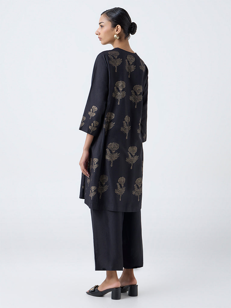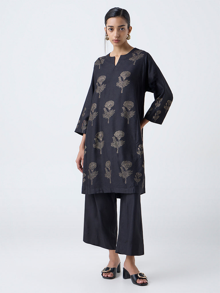 Minimal yet striking. this black kurta from Zuba is tailored in an A-line silhouette for a flattering fall. Crafted from a premium-blend fabric. it features elegant floral prints that lend quiet sophistication. The design is framed with a split and three-quarter sleeves. making it a refined choice for daytime occasions.