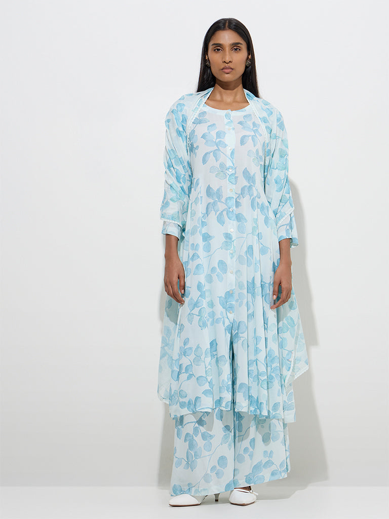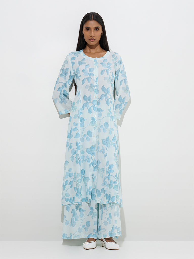 This blue kurta from Zuba showcases botanical prints in a breezy A-line silhouette for a graceful flow. Designed with a round neck that extends into a button placket. it features three-quarter sleeves for everyday ease. Its lightweight build promises lasting comfort.