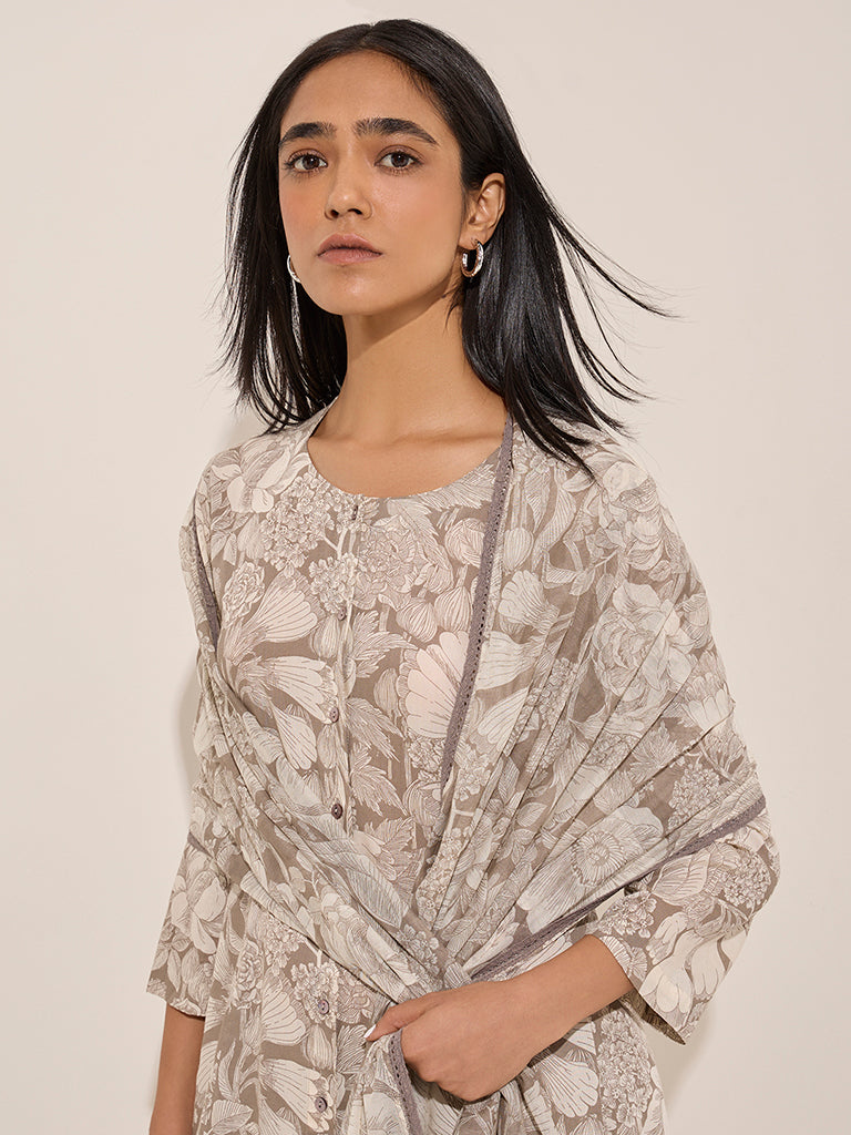 Zuba Brown Floral Printed Cotton Stole