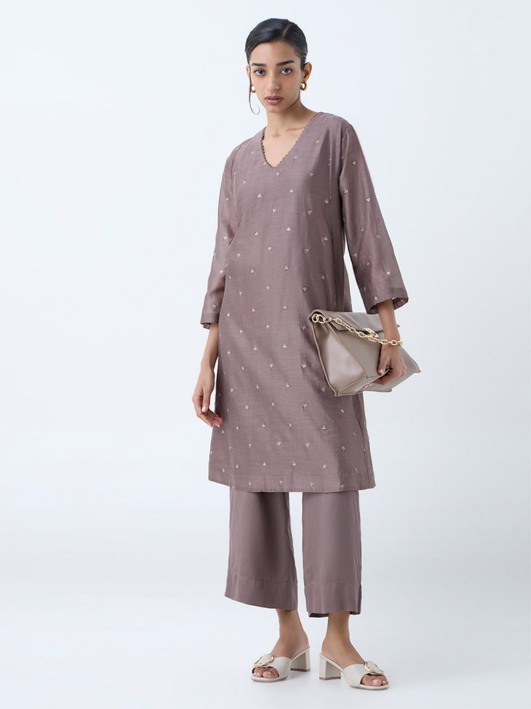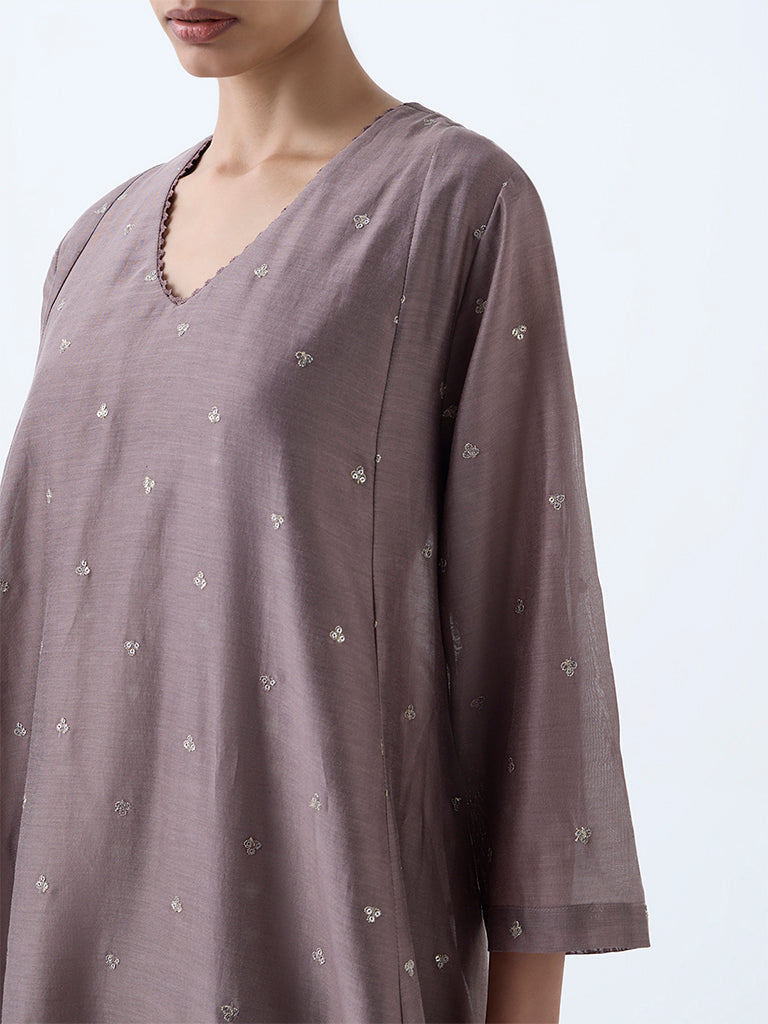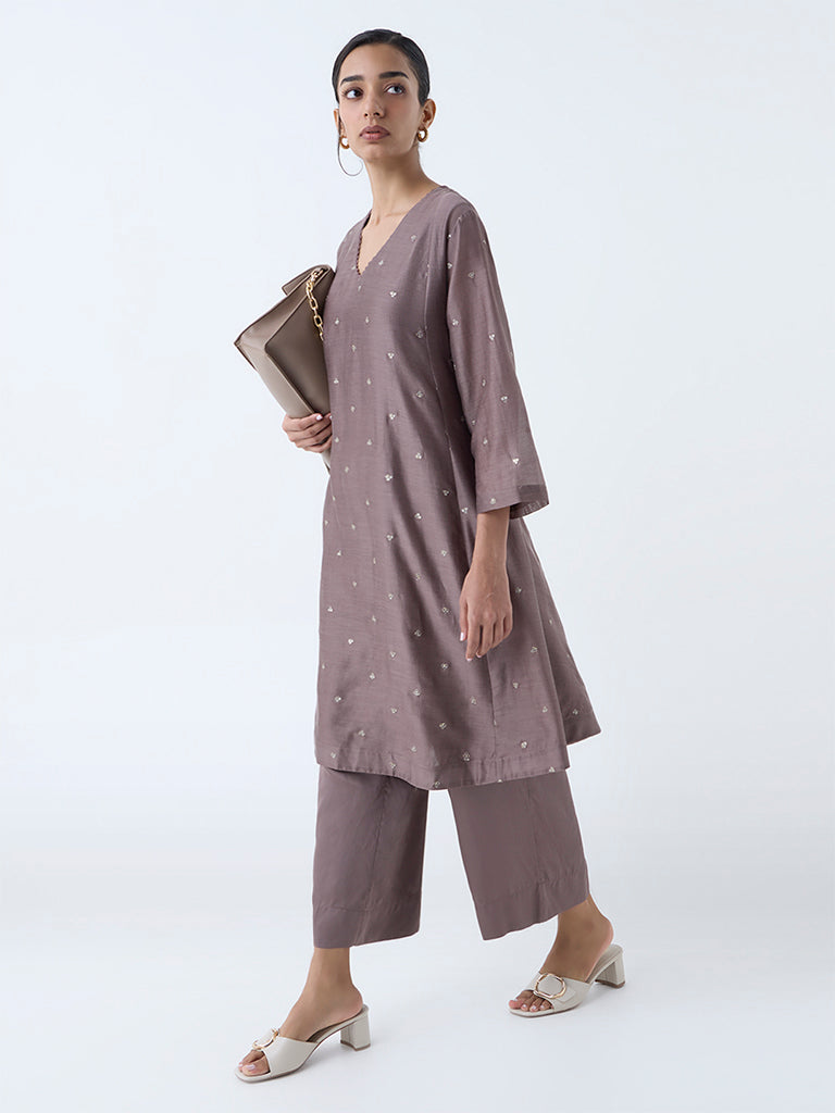 Make every celebration shimmer with this brown A-line kurta from Zuba. adorned with sequin embellishments that catch the light beautifully. Tailored from a lightweight fabric with an ultra-smooth inner. it’s finished with a flattering V-neck and three-fourth sleeves.