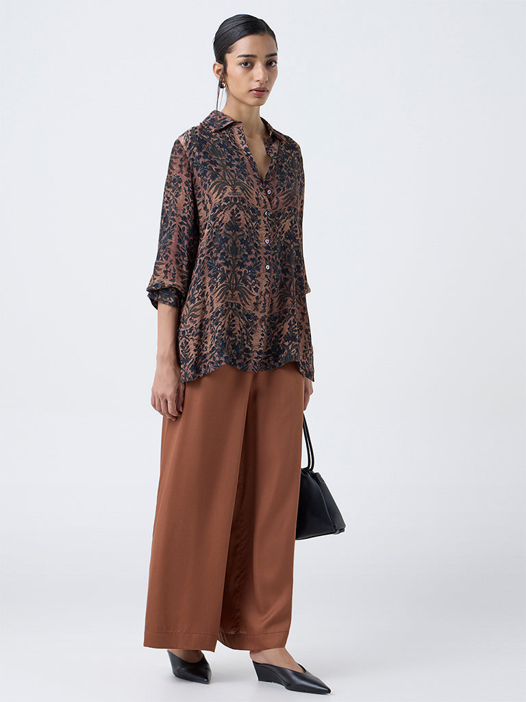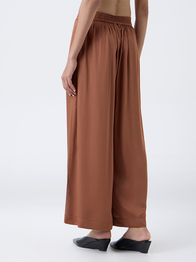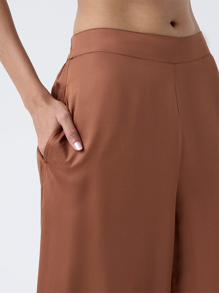 Zuba introduces these light brown palazzos. tailored from a lightweight fabric for a soft. fluid drape. Designed with an elastic waistband and adjustable drawstrings for comfort. they are finished with functional side pockets. A versatile essential that complements both printed and solid kurtas with ease.