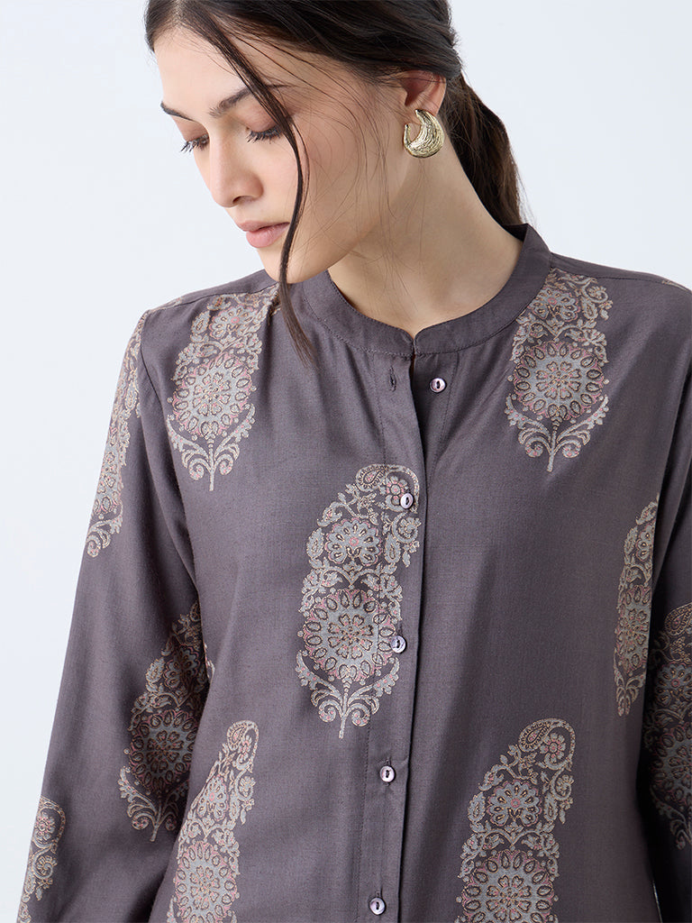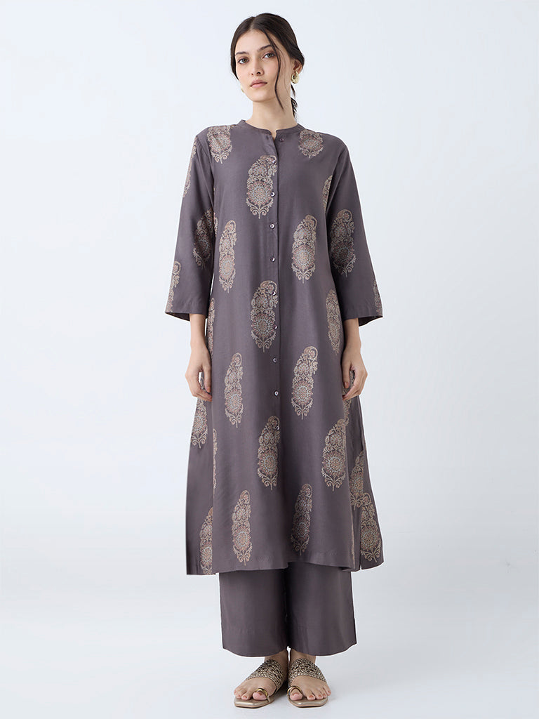 Zuba introduces effortless sophistication with this charcoal kurta. elevated by striking botanical prints. Shaped in a graceful A-line silhouette. it is styled with a band neck that flows into a buttoned placket and finished with three-quarter sleeves. Spun from an ultra-lightweight fabric. it’s a versatile piece that moves seamlessly from daytime ease to evening elegance.