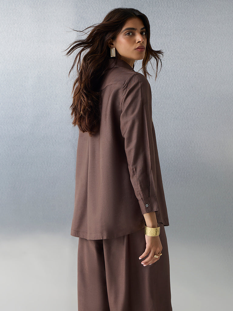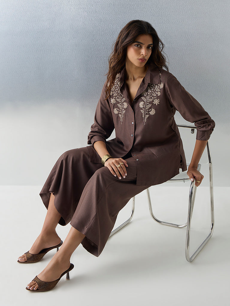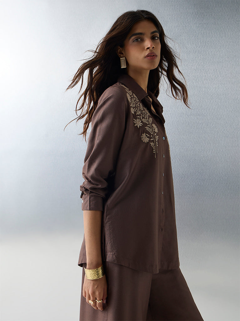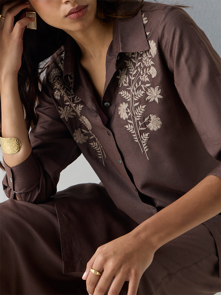 Zuba brings this dark brown tunic exhibiting floral embroidery on a cotton-blend fabric base. Designed with a notched collar. three-quarter sleeves and a button-up front. it brings together ethnic detailing and a polished finish. Perfect for both casual and semi-formal settings. it adds understated elegance to everyday wardrobes.