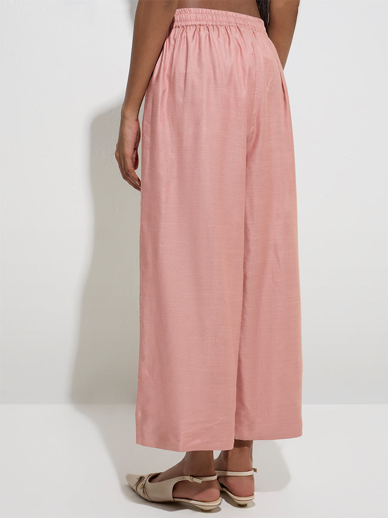 Zuba introduces these dusty pink palazzos. tailored from a lightweight fabric in a refined solid hue. Designed for ease and elegance. they feature a smooth elasticated waistband with adjustable drawstrings for a personalised fit.