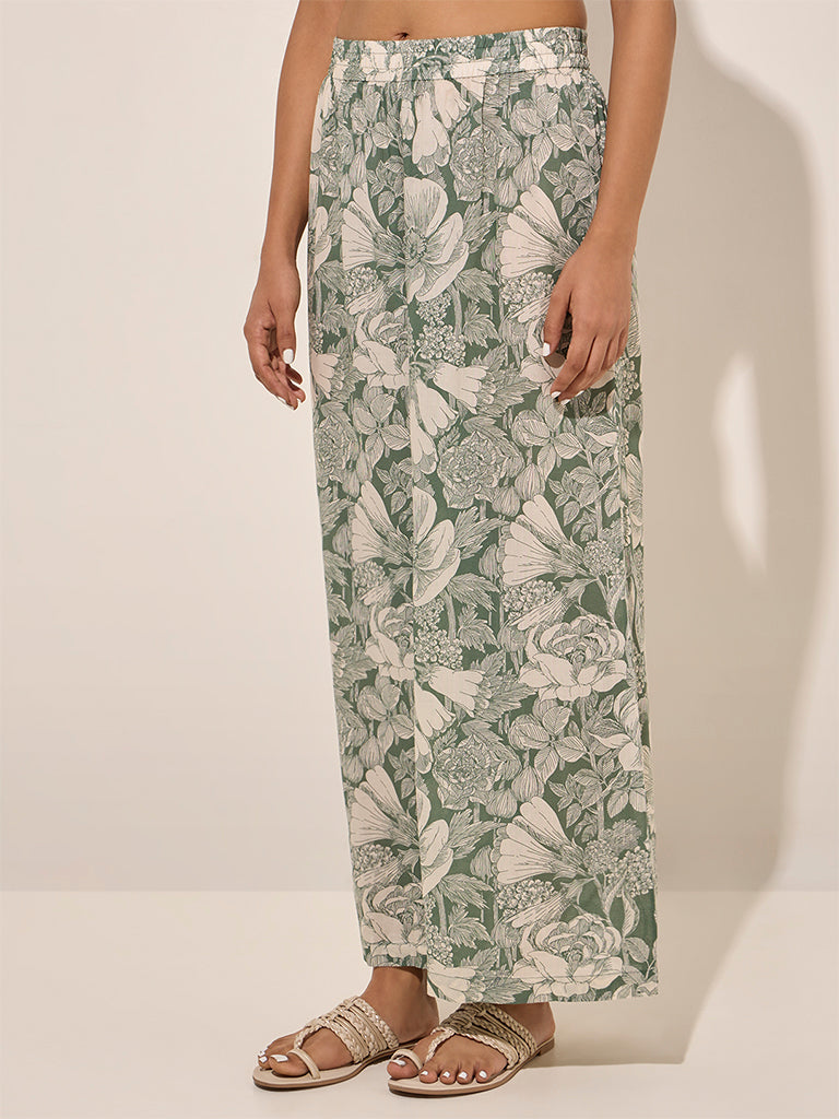 These green palazzos from Zuba are adorned with foliage prints. Made from a lightweight fabric. the ethnic bottom wear includes an elasticated waistband and attached drawstrings for a secure fit.