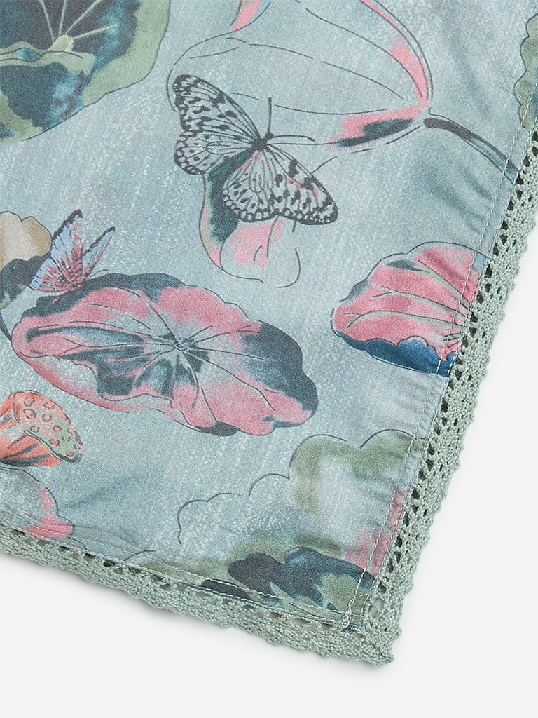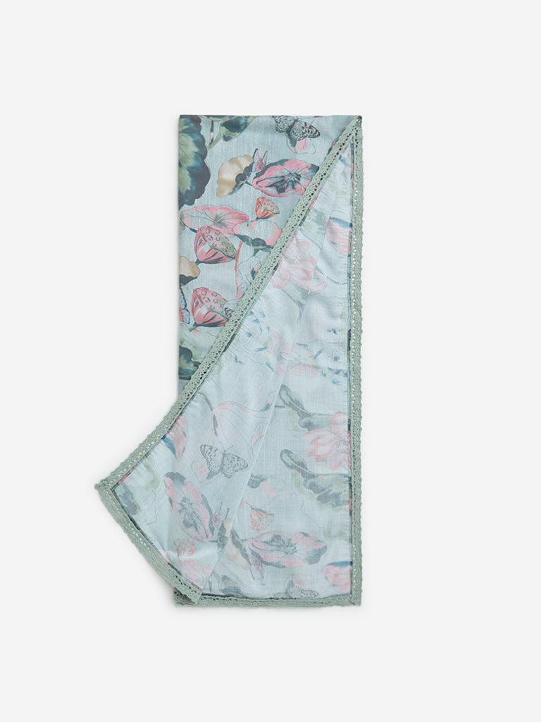 This green stole from Zuba is adorned with graceful foliage motifs and finished with a delicate lace trim. Crafted from lightweight fabric. it drapes effortlessly. making it the perfect accent to the matching kurta and palazzos for a refined. coordinated ensemble.