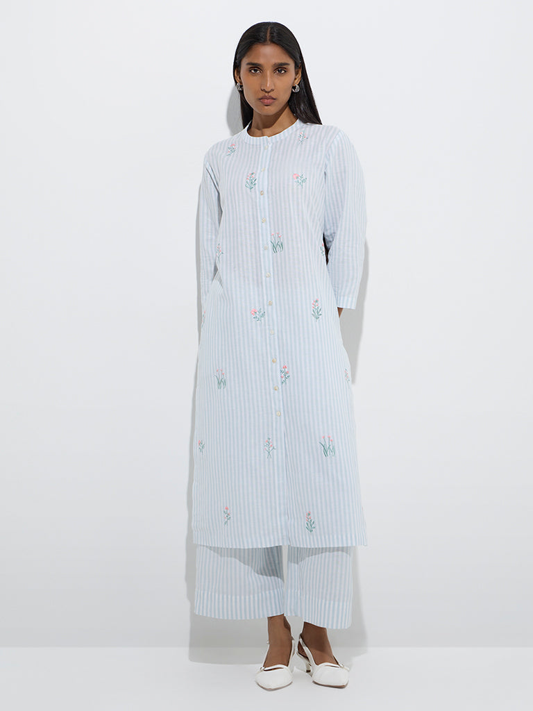 Zuba Light Blue Striped Cotton-Blend Straight Kurta