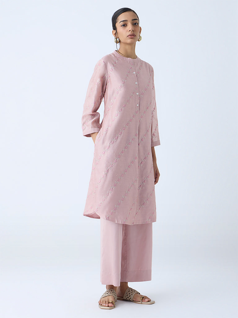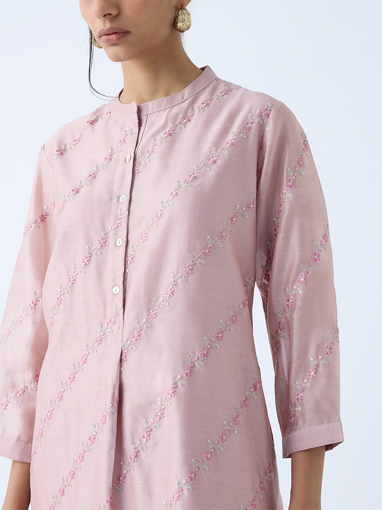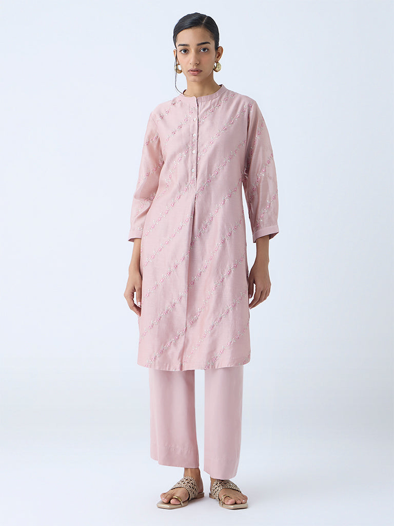 Poised and graceful. this light pink kurta from Zuba captures feminine refinement through delicate floral embroidery. Shaped in an airy A-line frame from breathable fabric. it features a band-neck collar and three-quarter sleeves that lend a structured elegance. A subtle button placket and side pocket finish the piece with thoughtful ease.