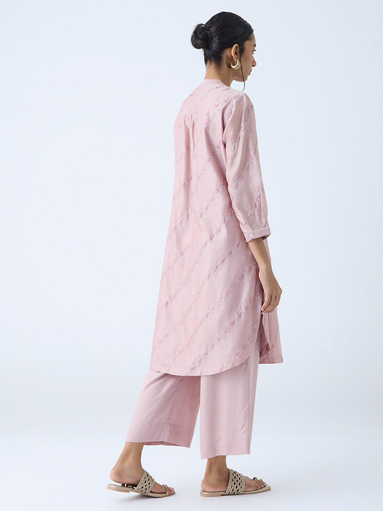 Zuba Light Pink Floral Embroidered A-Line Kurta