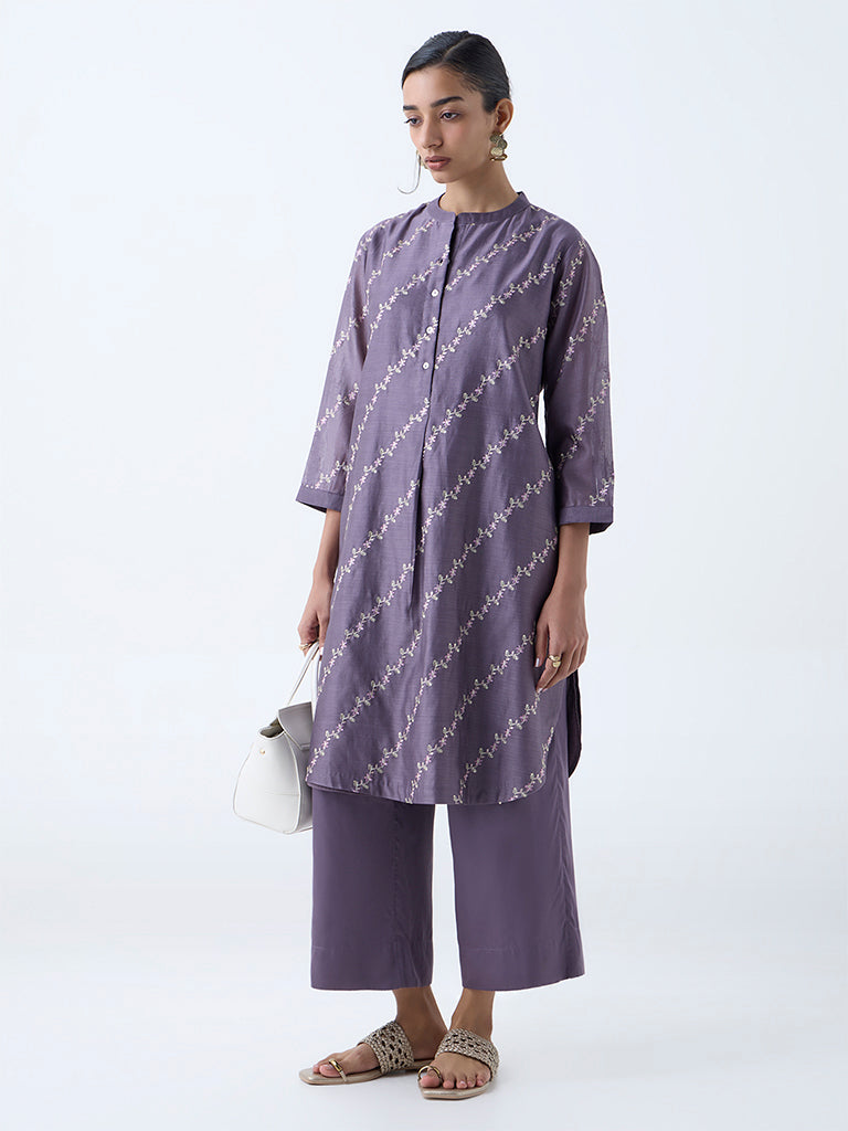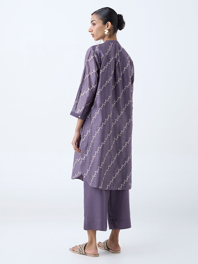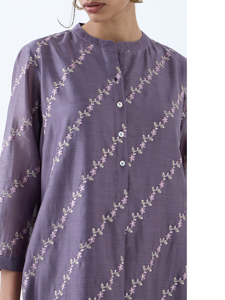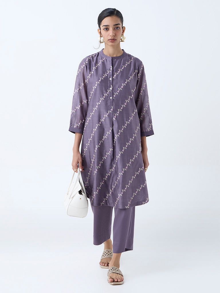 Zuba Mauve Floral Embroidered Cotton-Blend A-Line Kurta