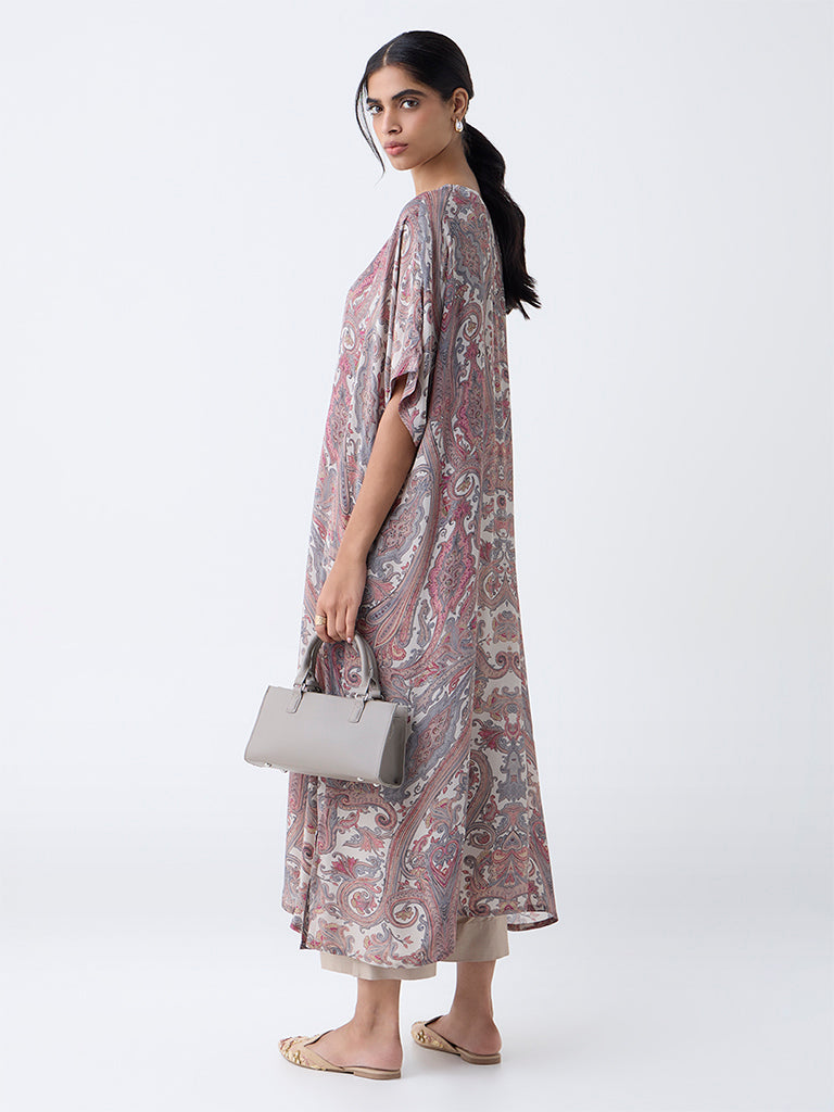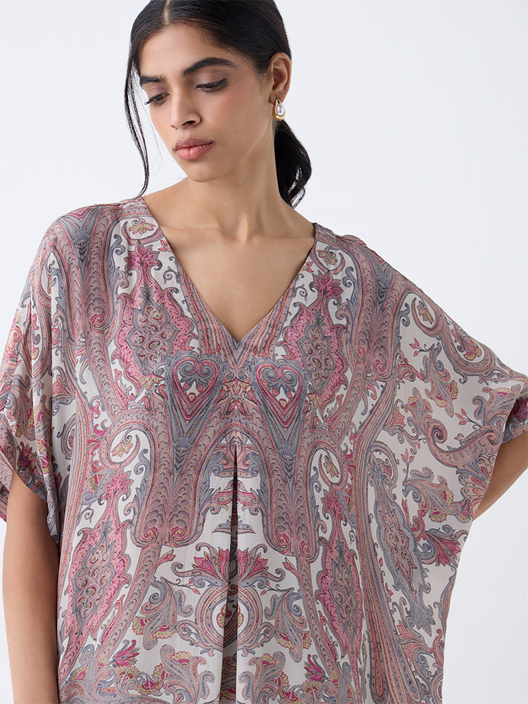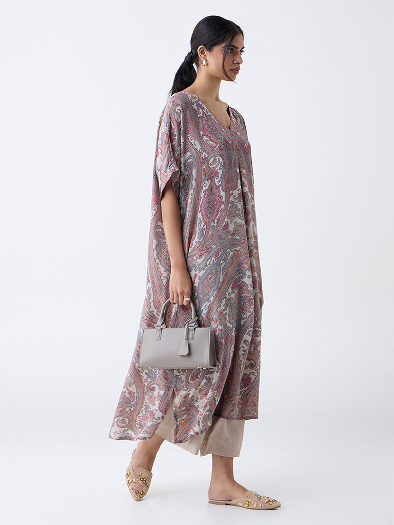 This multicolour kaftan from Zuba features vivid ethnic prints all over on the flowing silhouette. Crafted from a lightweight fabric. it is framed with a V-neck and dolman sleeves. A breezy piece that blends comfort with elegance. perfect for relaxed ethnic dressing.