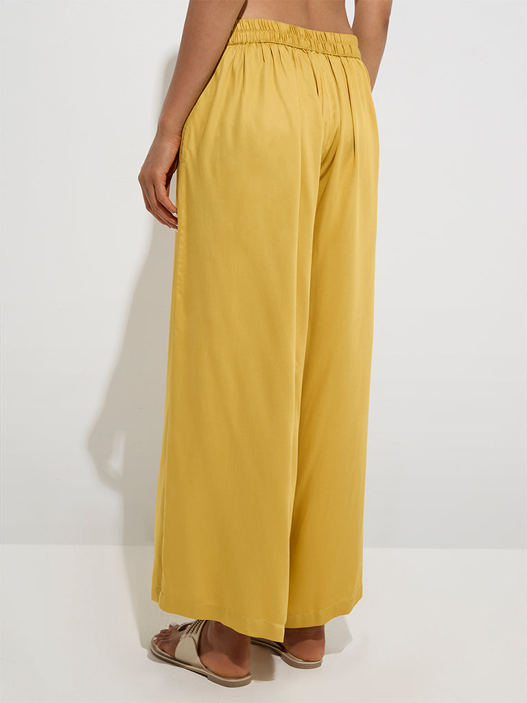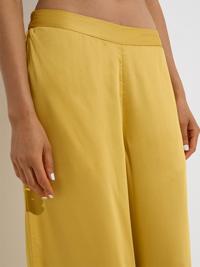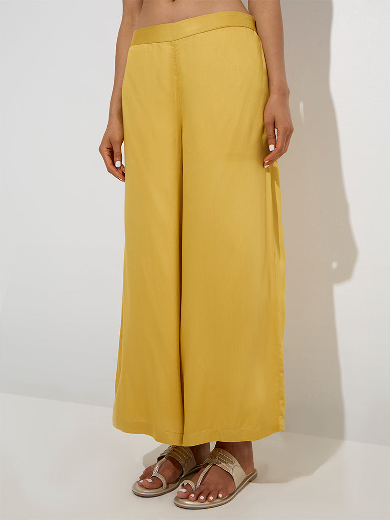 These mustard palazzos from Zuba are fashioned from a premium blended fabric that offers both structure and ease. Designed with an elasticated waistband for a comfortable fit. they also feature functional side pockets for added convenience.